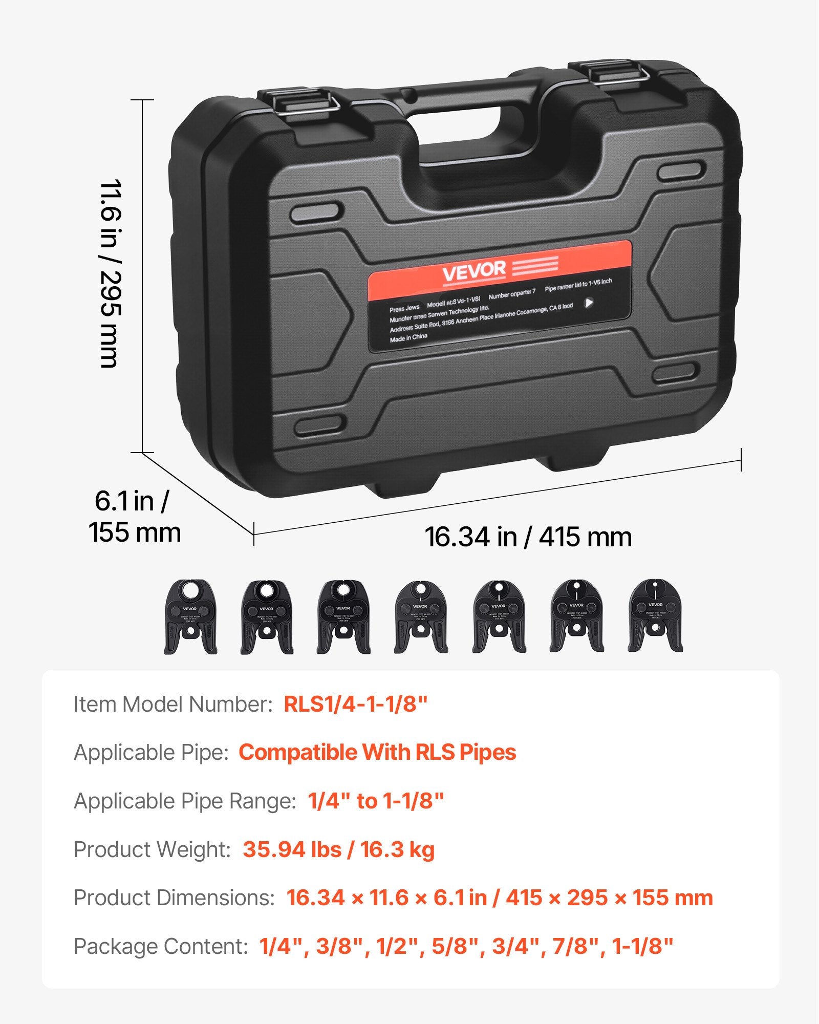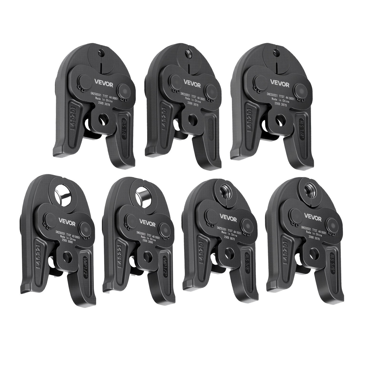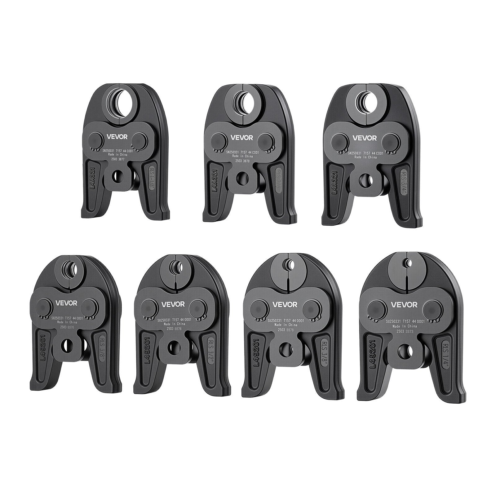 - 7PCS Pressing Jaws: VEVOR press jaws set includes 7 jaw sizes: 1/4", 3/8", 1/2", 5/8", 3/4", 7/8", 1-1/8". Compatible with VEVOR standard electric press tools (PZ-1550, PZ-3240, EB-1550 Model) and other brands (CT-400, RP310, RP310PLUS, RP318, RP320-E, RP330-B, RP330-C, RP340, RP350, RP351, M18 Model)