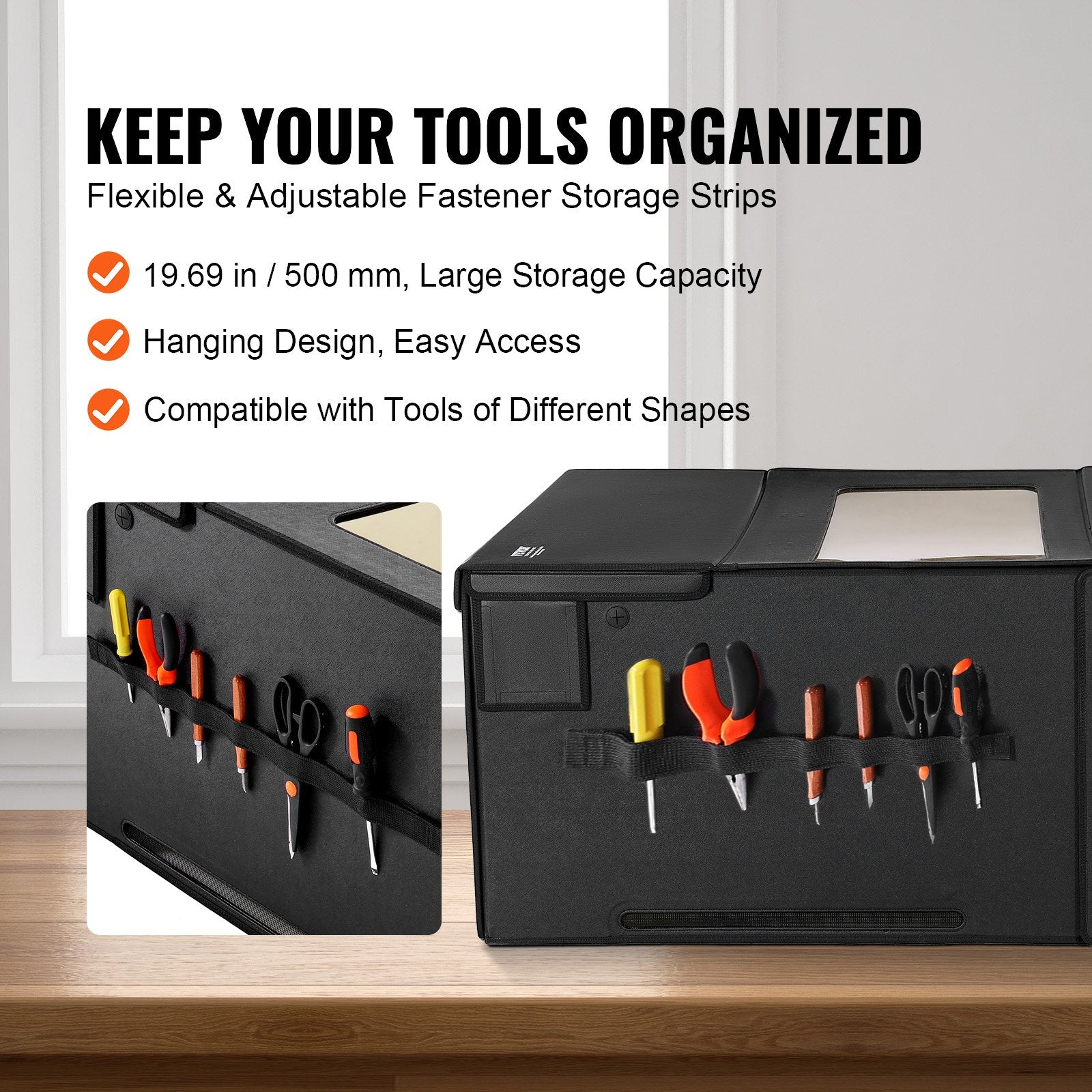 - Tool Storage: 2 x 19.69 in/500 mm Adhesive Fastener Straps