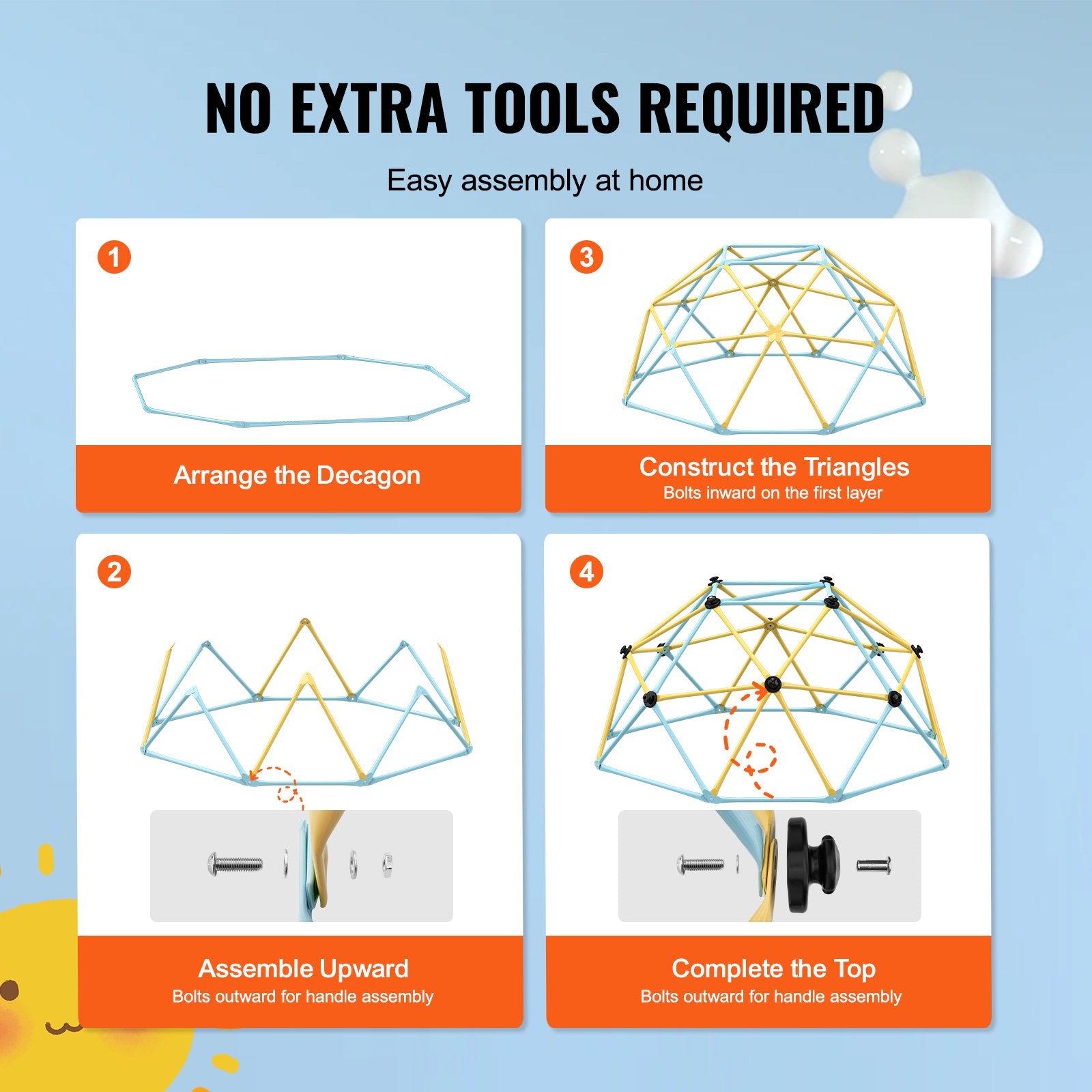 - Easy Setup: Everything you need is included, from installation tools to detailed manuals and video guides. Our clear instructions will effortlessly guide you through assembly, allowing you to quickly create a fun playground for your children with our kids climbing dome.