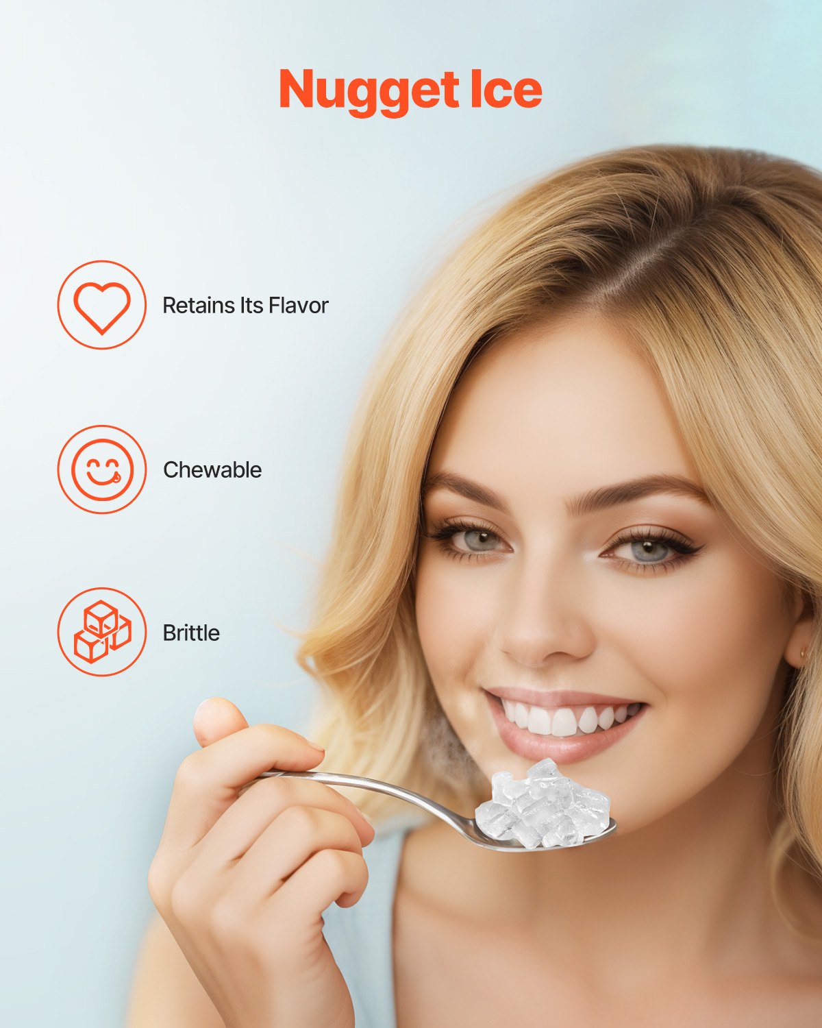 - Nugget Ice: The nugget ice cubes are made from crushed ice cut with blades, unlike traditional hard cubes. They are brittle, chewable, and break easily, with an ideal melting speed that preserves the original flavor of whiskey and cold drinks