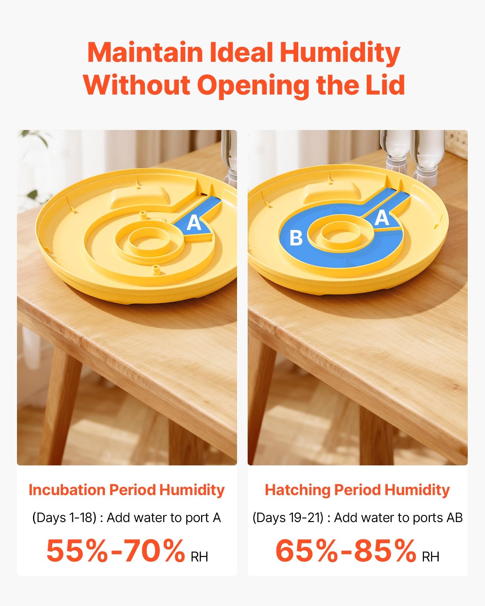 - Automatic Water Refill: The egg incubator includes an AB dual-zone auto refill system, allowing you to add water without opening the lid. One bottle lasts 8–10 days, minimizing manual refills and easily maintaining ideal humidity