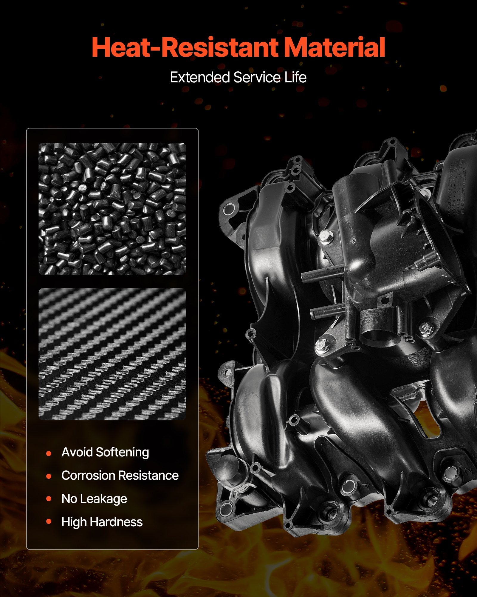 - Tough, Heat-Resistant Build: The engine intake manifold replacement is crafted from reinforced nylon and glass fiber for better sealing, heat resistance, and durability. No warping, no leaks—holds up near the engine's hot zones