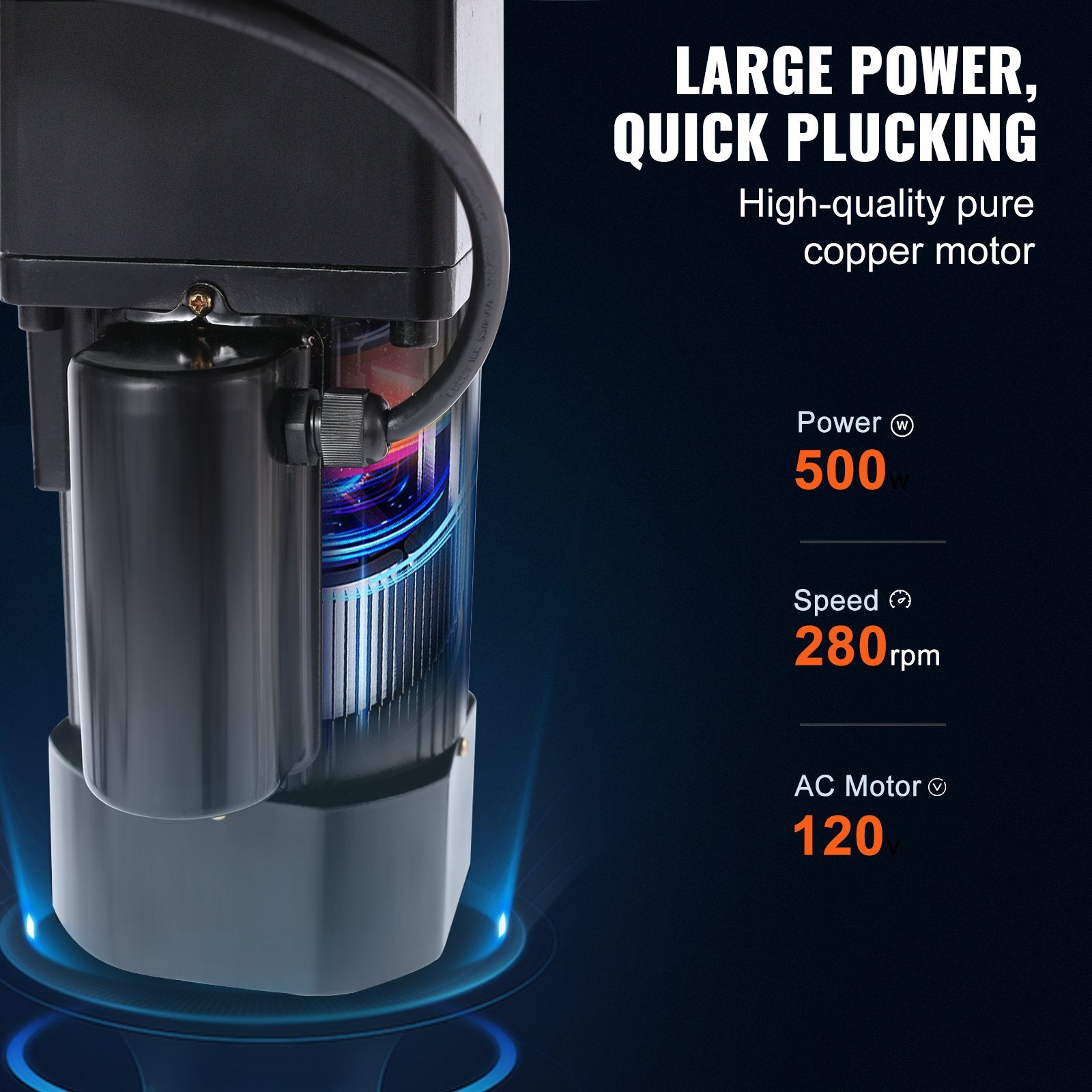 - It Is Time to Pluck: Power: 550W; Motor Speed: 280 RPM. Are you ready to pluck those feathers? Our chicken plucker machine has a pure copper motor that provides maximum efficiency and durability. It is designed to quickly de-feather chickens in just 10-30 seconds and can handle 2-4 chickens at a time.