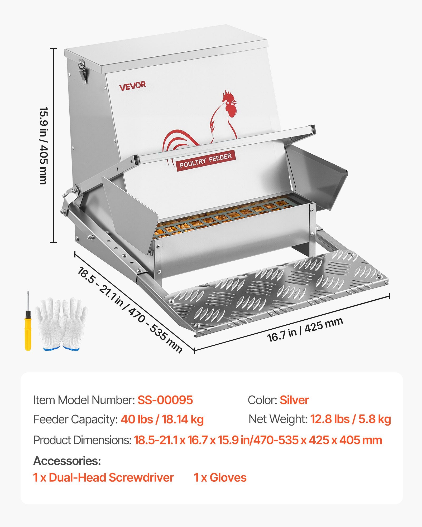 - Adjustable for Different Poultry: The treadle poultry feeder adjusts from 18.5 in (470 mm) for small/young birds to 20.7 in (525 mm) for medium/adult poultry. Textured, non-slip surface helps chickens adapt, and side panels avoid injury from side feeding