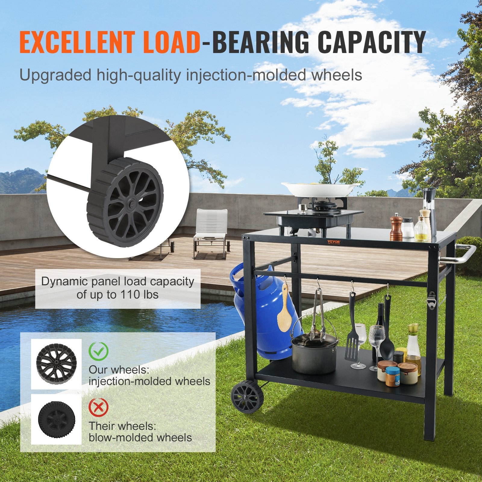 Outdoor Grill Dining Cart with Double-Shelf, BBQ Movable Food Prep Table, Multifunctional Iron Table Top, Portable Modular Carts for Pizza Oven, Worktable with 2 Wheels, Carry Handle, Black
