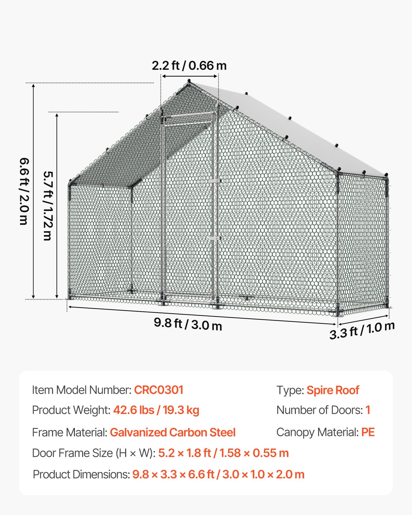 Large Metal Chicken Coop,9.8 x 3.3 x 6.6 ft, Walk-in Chicken Run House with Waterproof Cover & Sturdy Frame, Spire Roof Poultry Cage Duck Pen for Rabbit Hen Goose Outdoor Backyard Farm Use