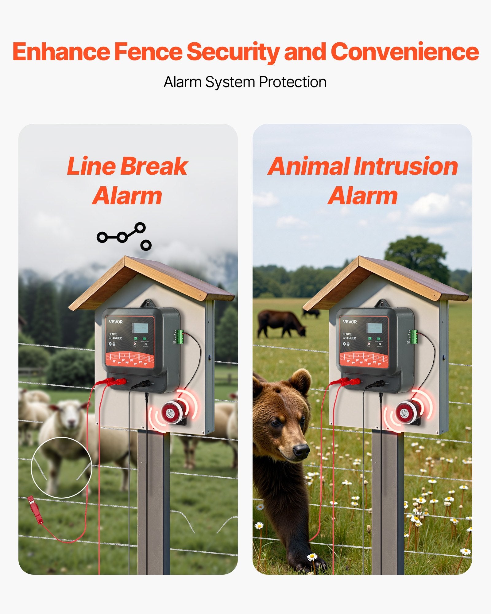 - Alarm System Equipped: The alarm alerts you immediately if there is a fence fault, power interruption, or animal intrusion. The alarm system outputs through a passive switch and horn, ensuring quick response to any issue, keeping your fence secure.