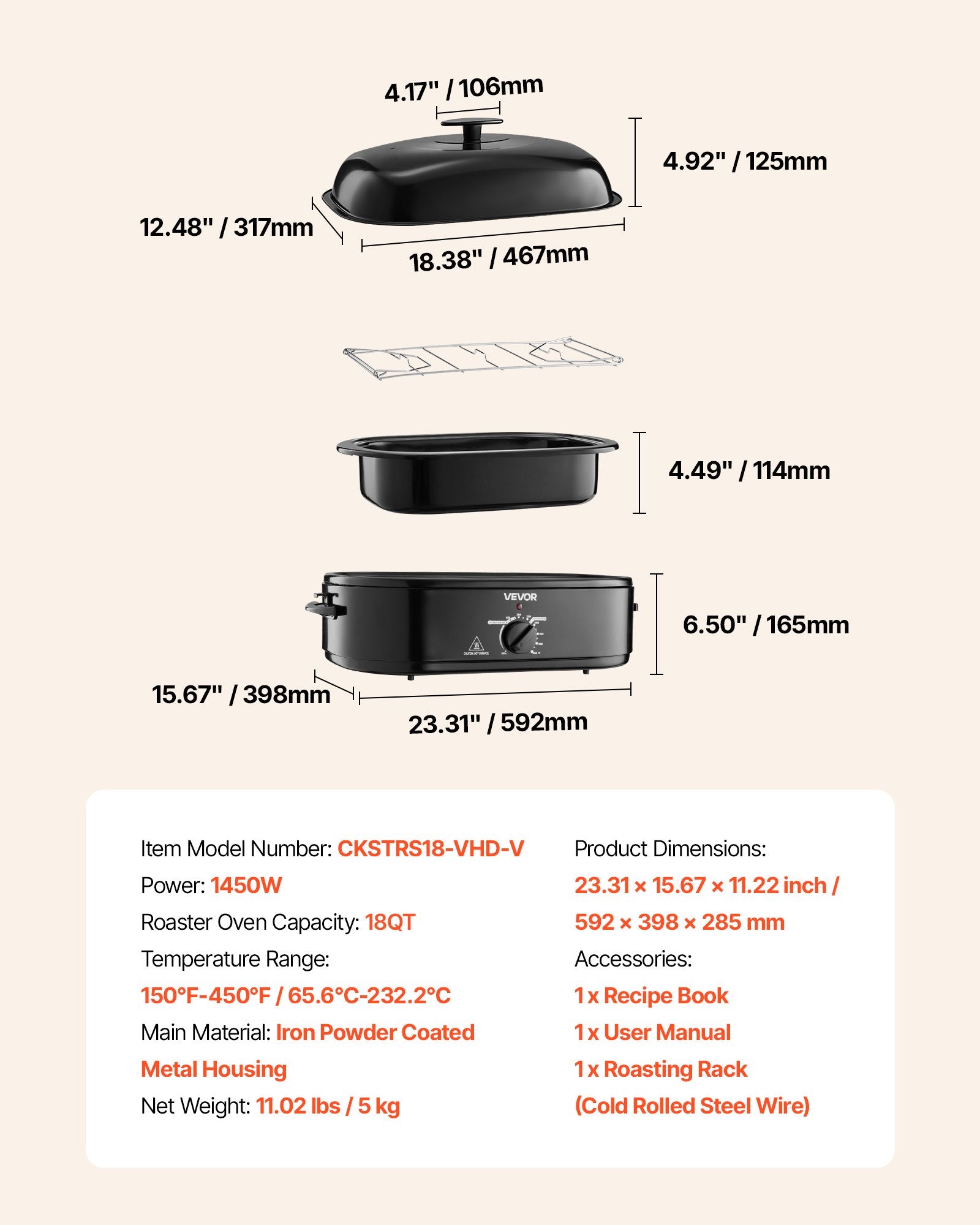 - Large 18QT Capacity: With an 18Qt interior, VEVOR electric roaster oven easily fits a whole turkey without hassle. Whether it's a holiday feast or a casual get-together, it's your go-to solution for serving large, delicious meals