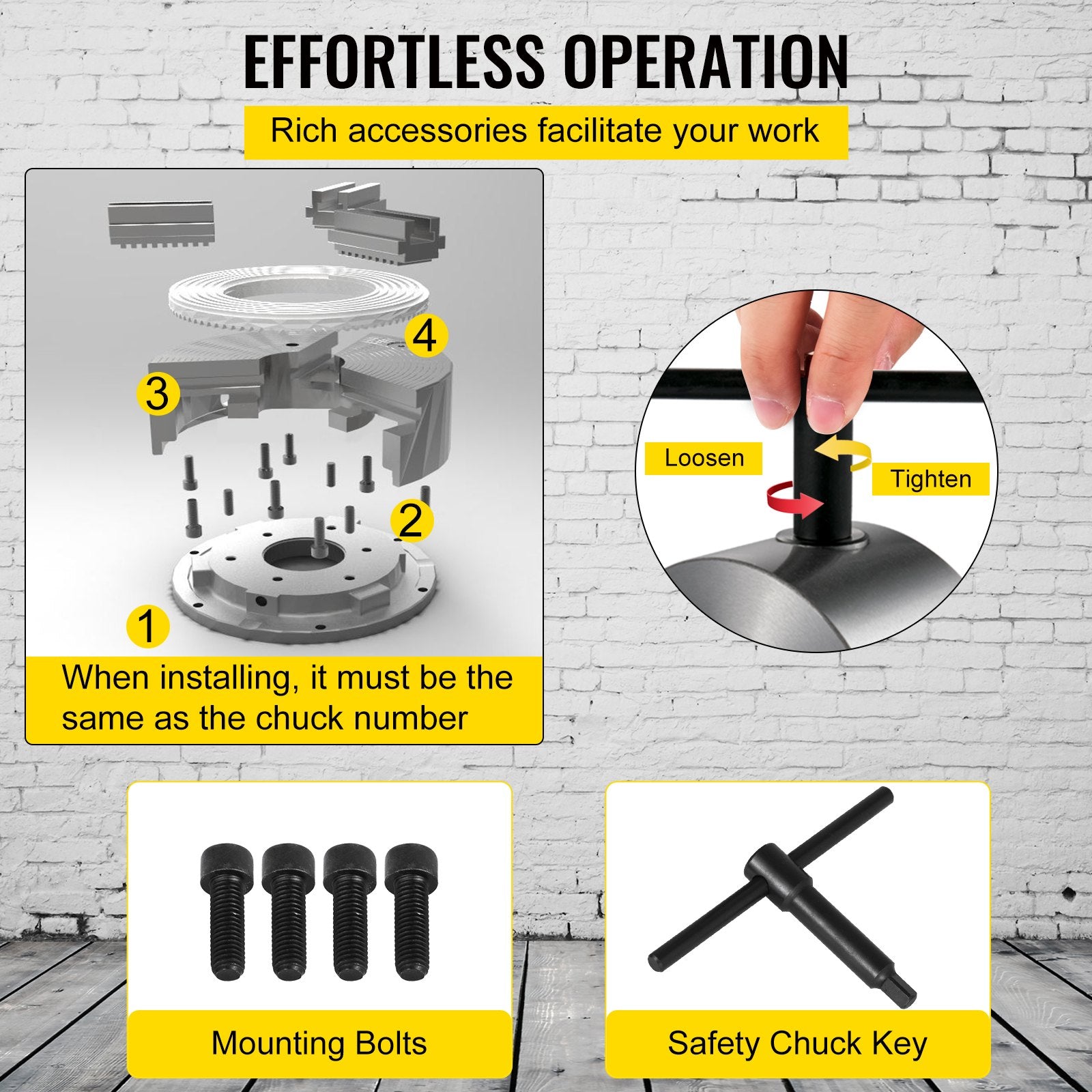 - High Precision: The 4-jaw lathe chuck works accurately, bearing tolerance is of ≤ 0.003 inch / 0.07 mm to ensure satisfying metal processing. The accessory screws make the scroll chuck highly adaptable and can be used with the same series of jaws as the chuck.