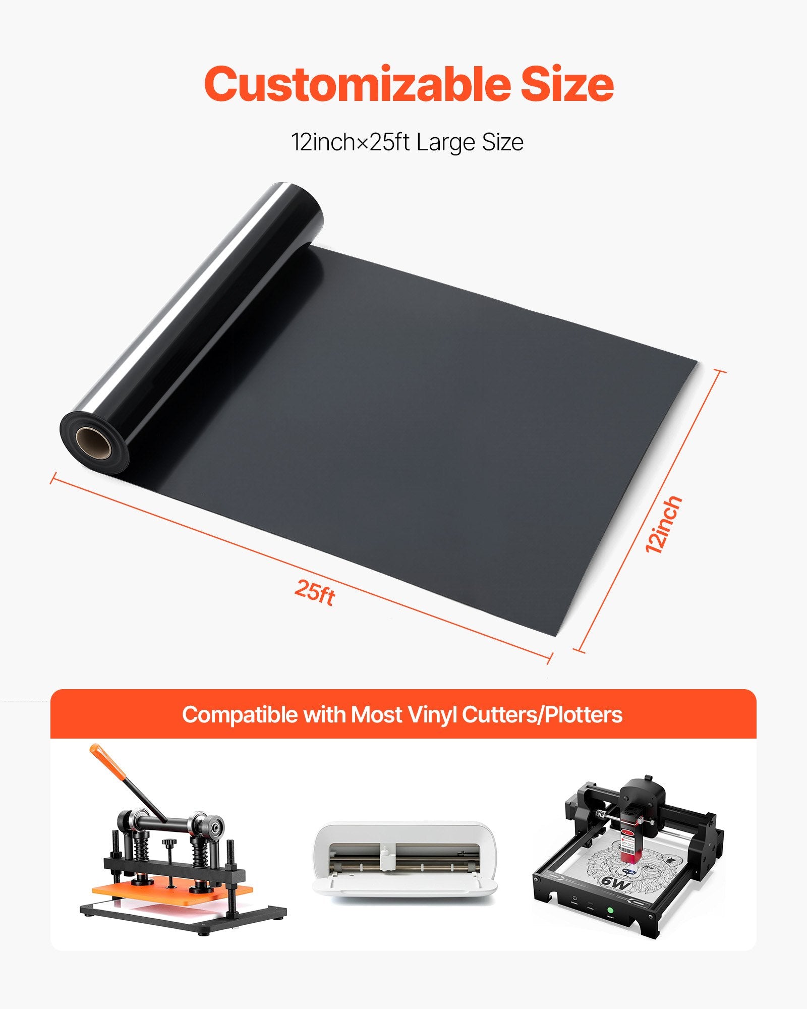 Heat Transfer Vinyl, 12 in x 25 ft, Glossy Black HTV Iron on Vinyl Roll, Easy to Cut and Weed, Strong Adhesion, Compatible with Cutting Machines, for Various Materials, T-shirts, Pillows, Hats