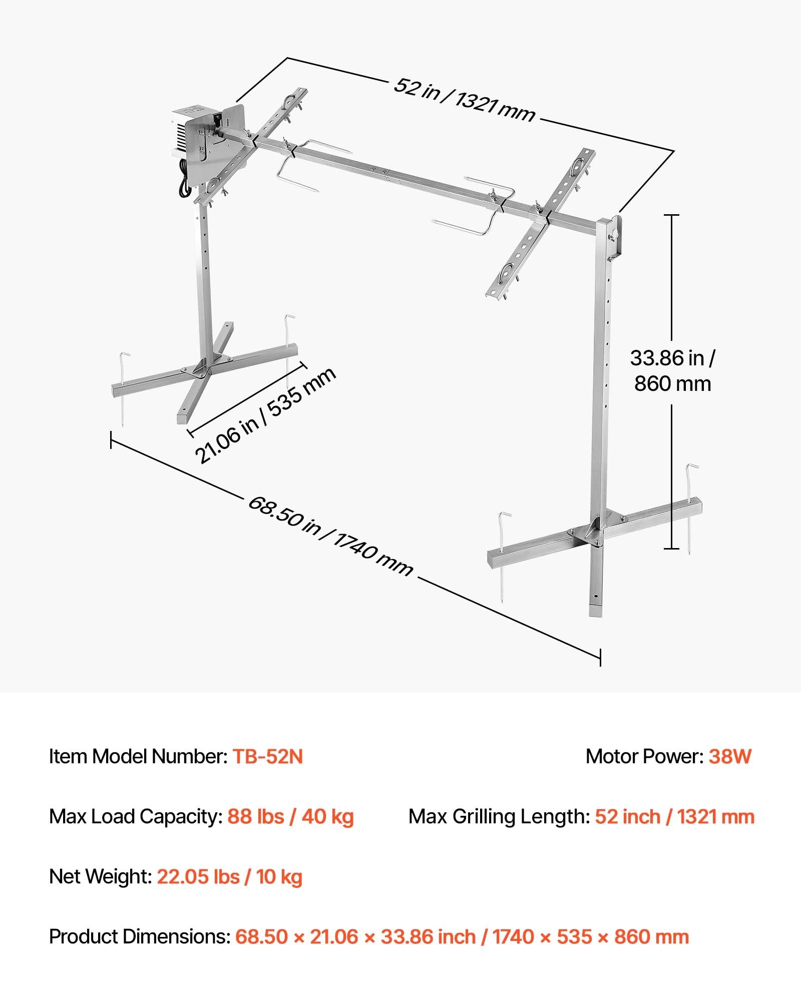 - Heavy-Duty Capacity: Designed to handle up to 88 lbs/40 kg, this rotisserie grill's 52-inch/1321 mm frame accommodates pigs, lambs, turkeys, and more. Ideal for creating large, evenly cooked meals that impress family and friends at any gathering