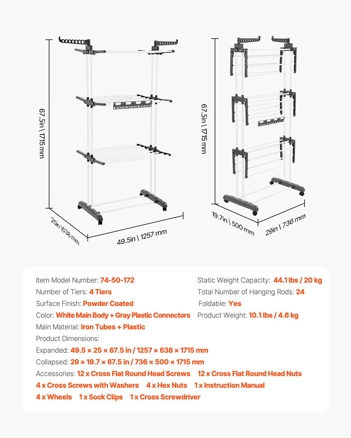 - Large Capacity: Featuring a spacious four-tier design with 24 hanging rods and 2 side wings (each with 7 hooks), this drying rack has increased flexibility and ample space for clothes, pants, scarves, towels, socks, and blankets. It easily meets all your drying needs.
