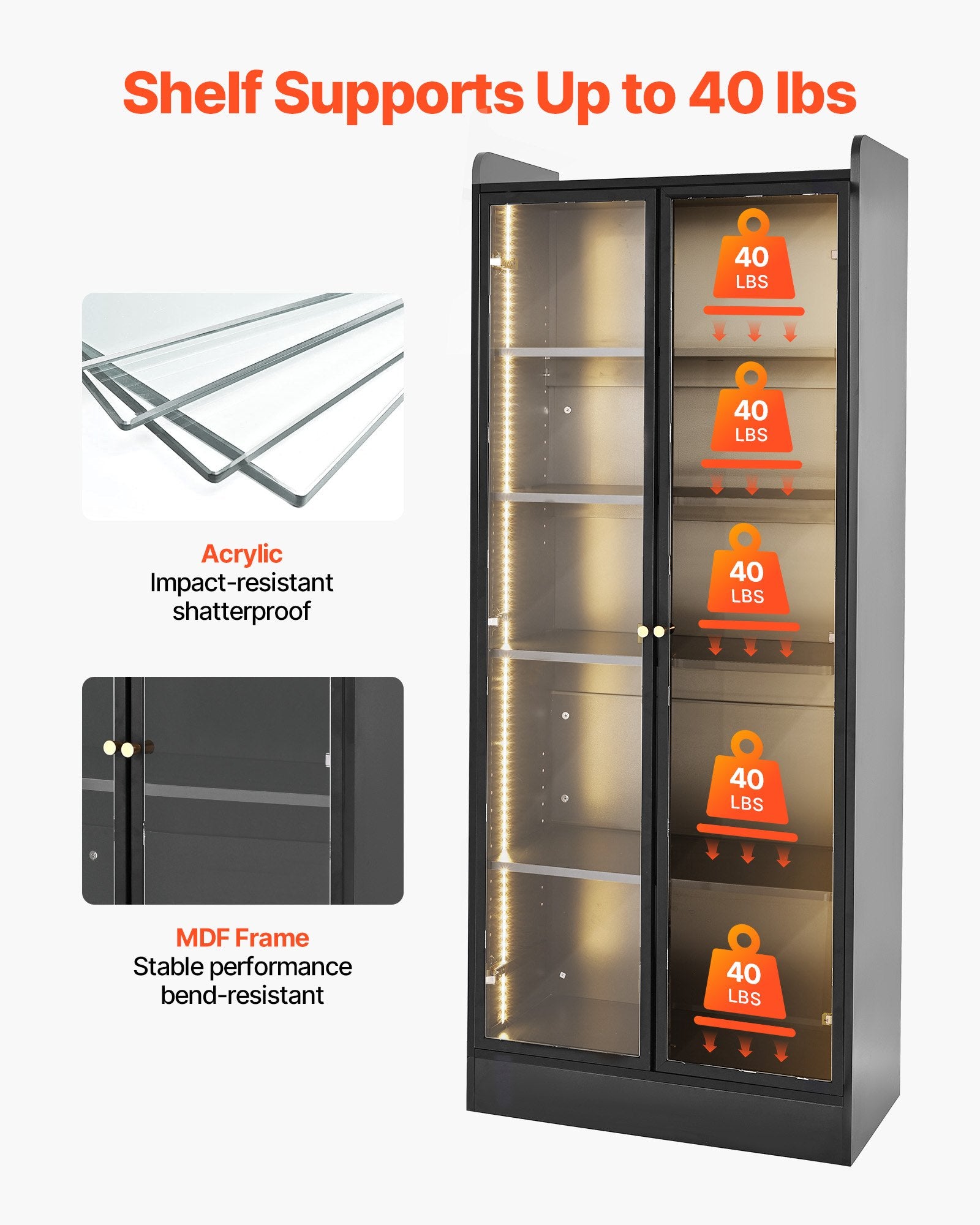 - Sturdy and Durable: Made of thick density fiberboard and acrylic doors, this display cabinet with anti-tip bracket prevents shaking, warping, and collapse. Each shelf supports up to 40 lbs. Finished with PVC edge banding and melamine veneer, it's moisture-resistant and won't peel—ideal for long-term collectibles display