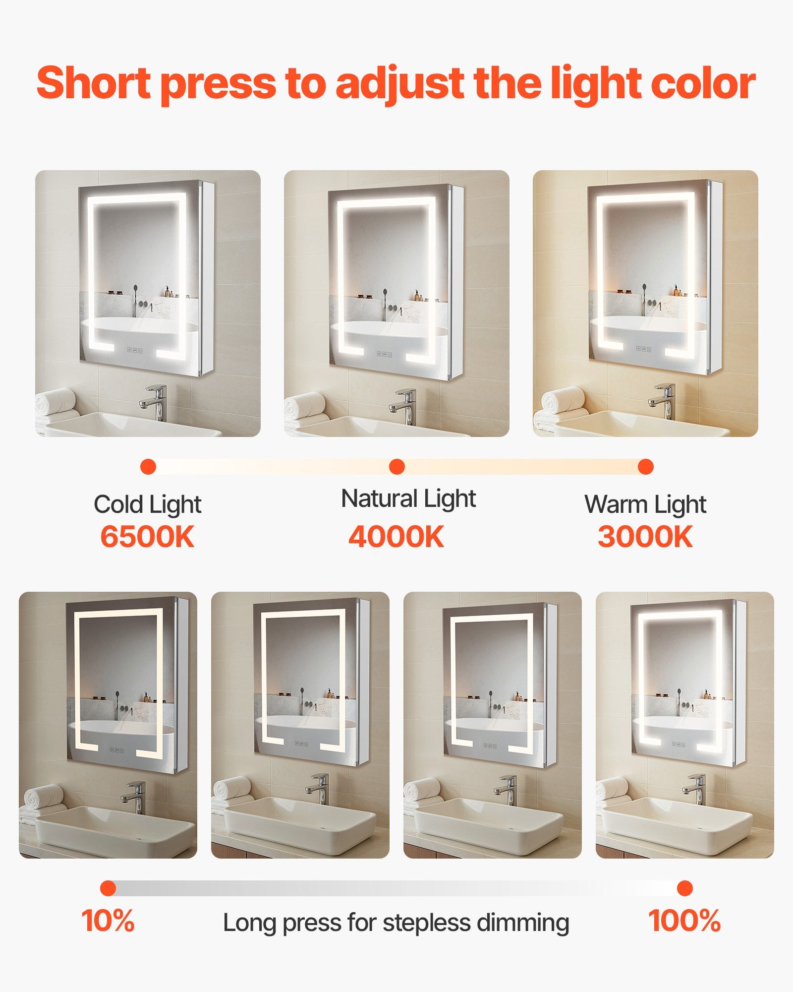 - Brightness & 3 Color Temperatures: Our lighted bathroom mirror cabinet offers stepless dimming and 3 color temperatures, ideal for makeup or low-light use at night. It also remembers the last brightness setting automatically.