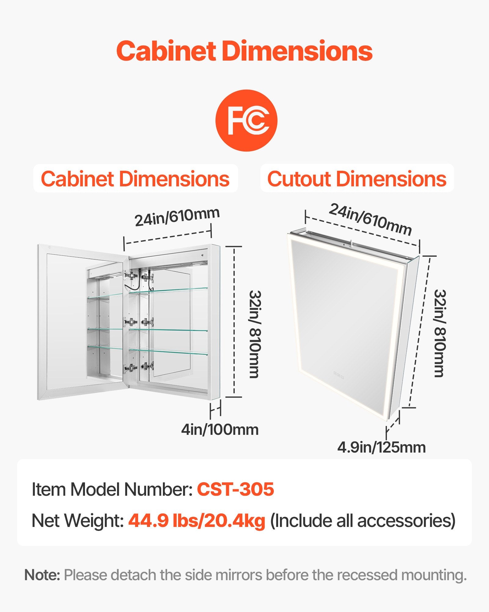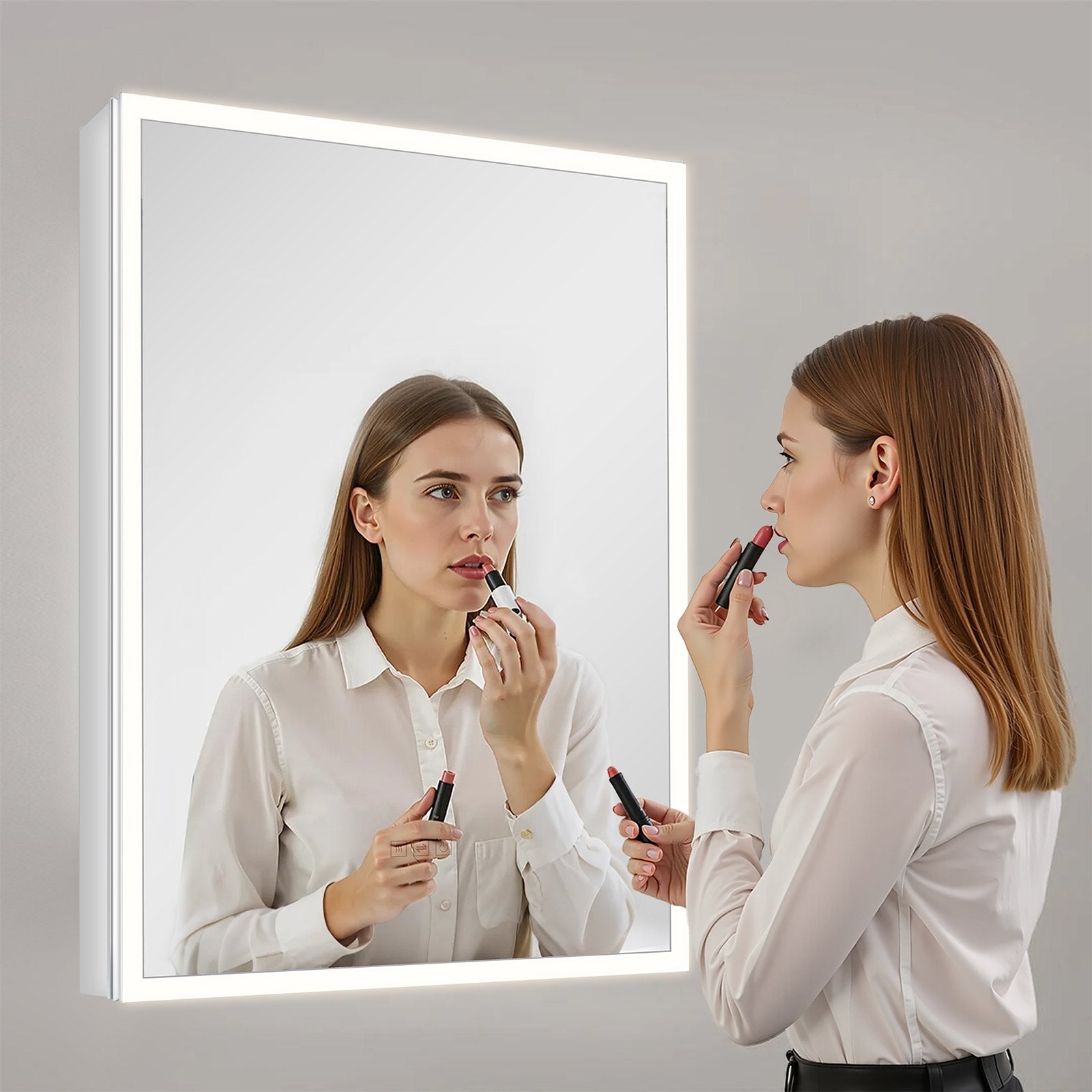 - One-Touch Anti-Fog: With a one-touch anti-fog function, the LED mirror cabinet quickly heats the center of the mirror to clear fog, ensuring a clear reflection even in humid bathroom conditions.