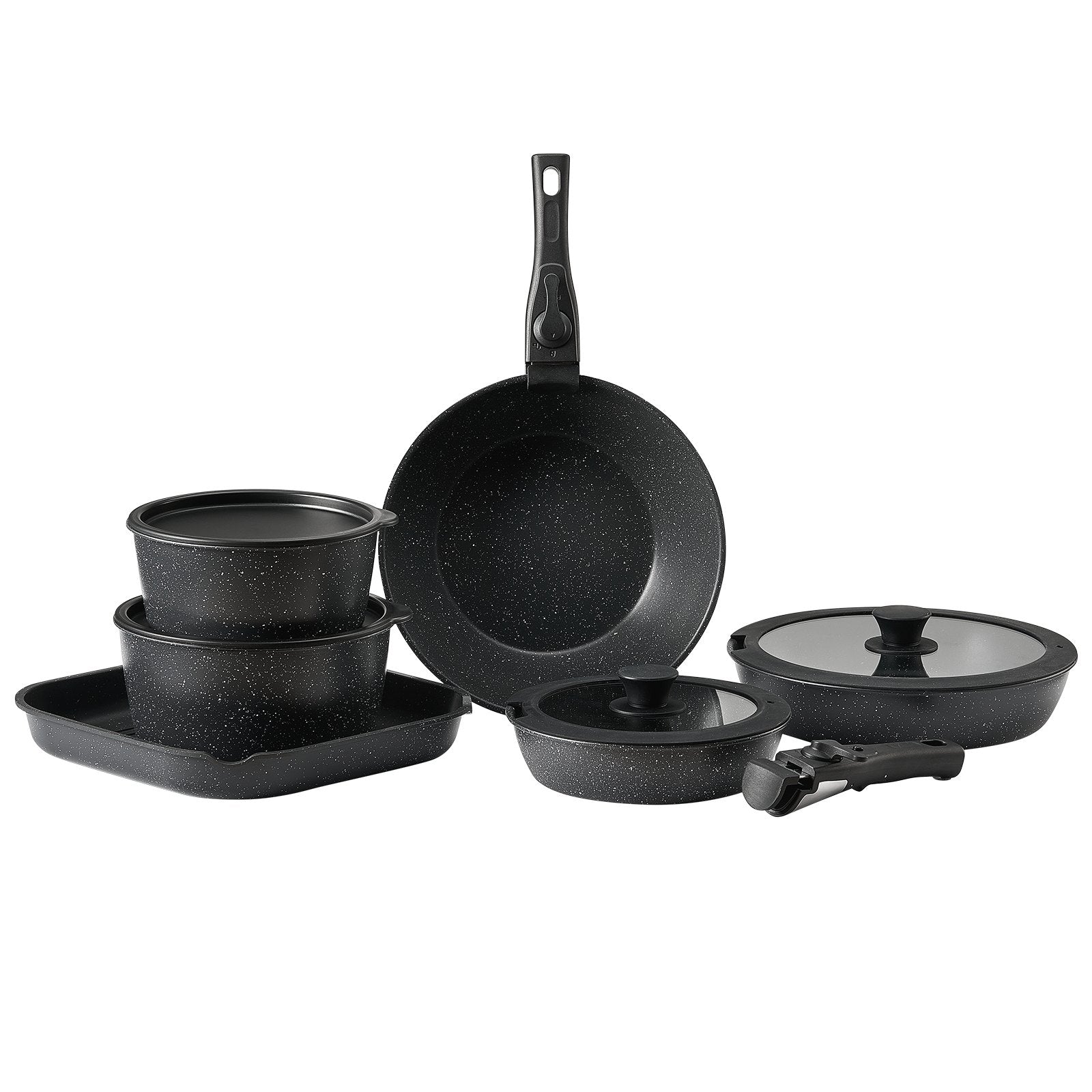 - Easy to Store: The cookware set is designed with a detachable handle system, allowing easy replacement with just one press. Removing the handles saves up to 70% storage space, making it convenient for stacking and compact storage in cabinets or RVs