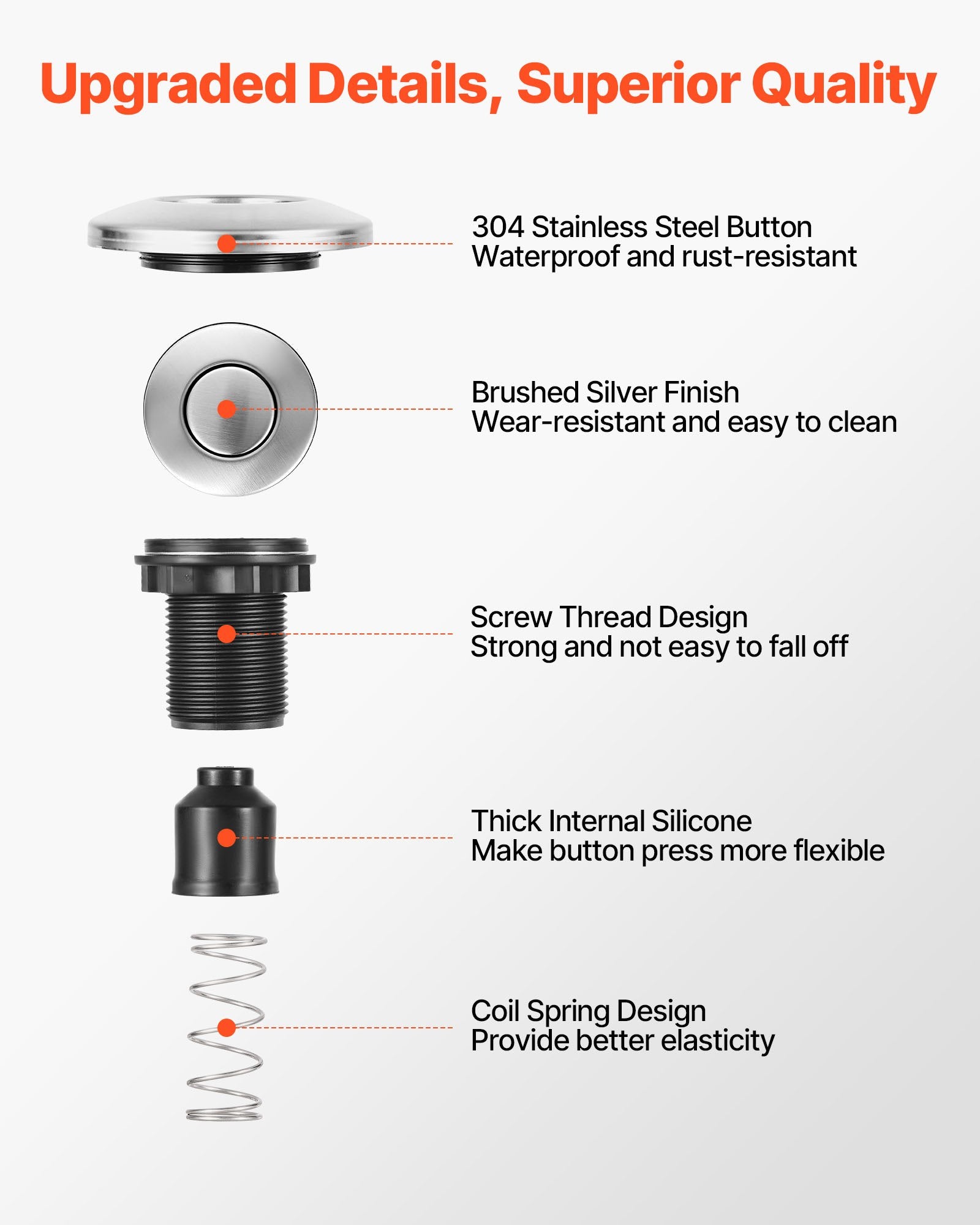 - More Enhanced Designs: Our air switch kit for waste disposer features a screw thread design—strong and not easy to fall off; thick internal silicone ensures a more flexible press, and the coil spring provides enhanced elasticity. Comes with an extended 4.92 ft / 1.5 m air tube for easy installation