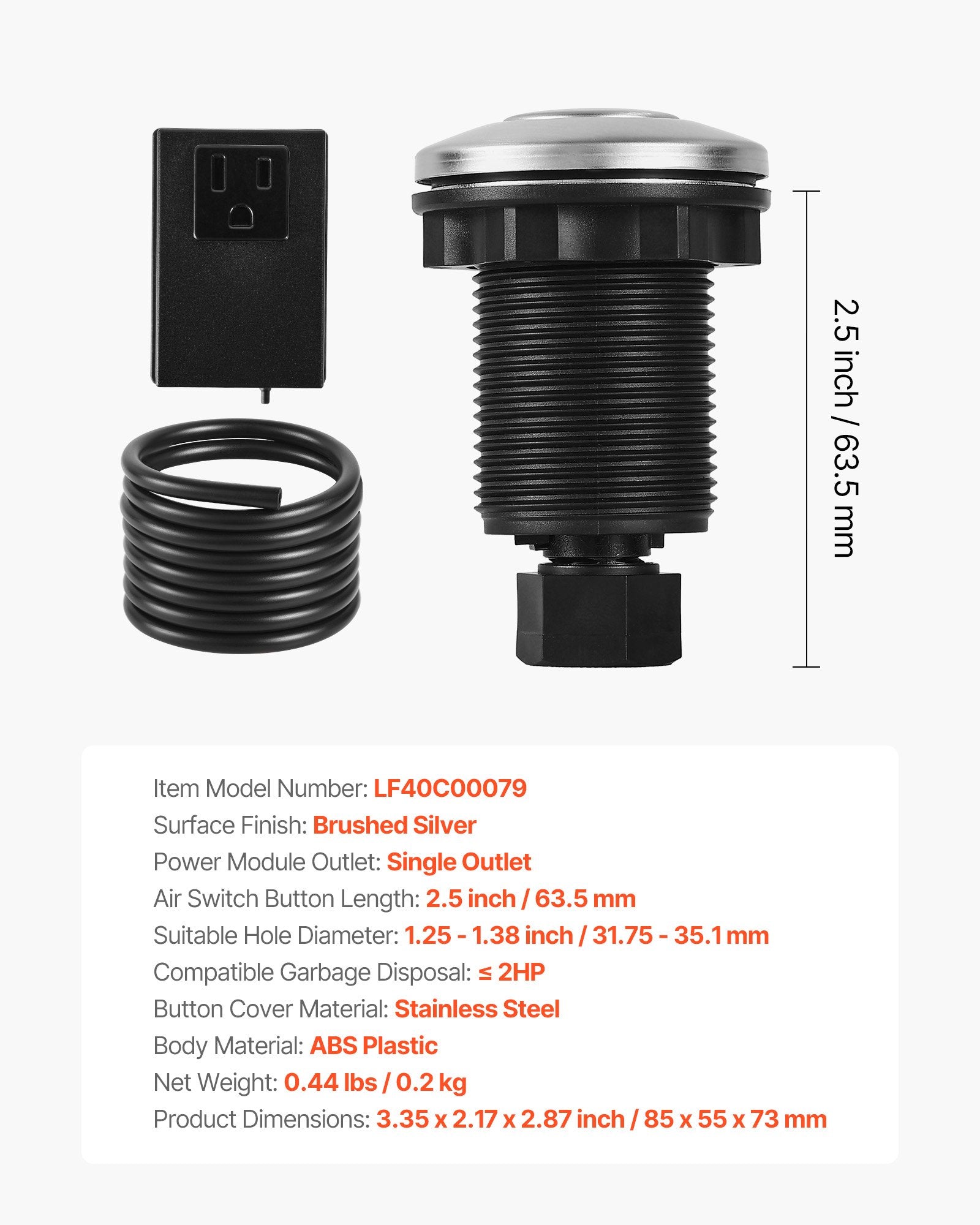 - Wide Compatibility: This VEVOR garbage disposal air switch kit fits standard sink hole diameters of 1.25–1.38 inch / 31.75–35.1 mm. The air switch button is 2.5 inch / 63.5 mm long, suitable for stainless steel sink countertops and compatible with most garbage disposal brands (≤2HP)