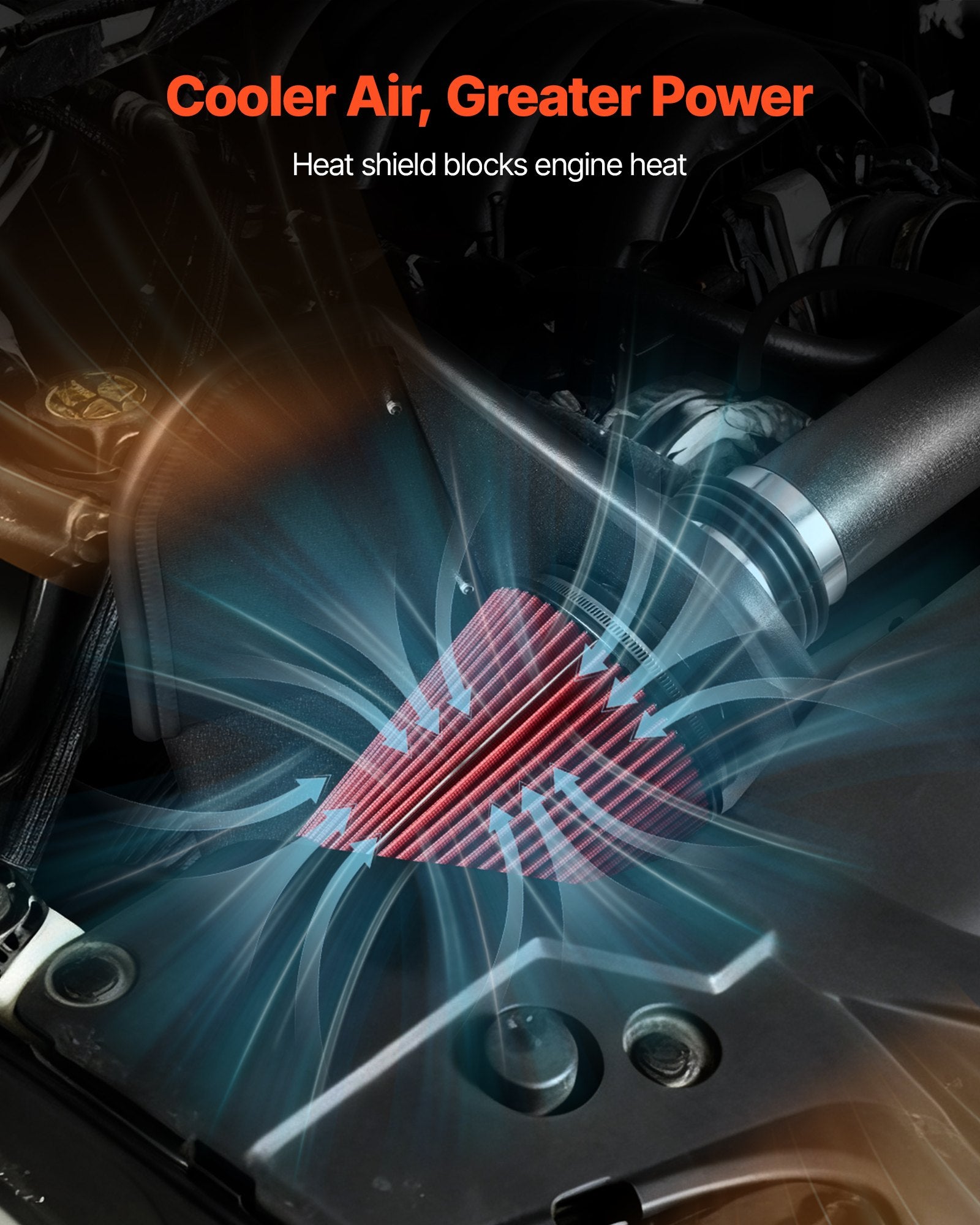 - Heat Protection: Equipped with a durable heat shield and smooth aluminum intake tube, this cold air intake kit blocks engine heat effectively and lowers the intake temperature