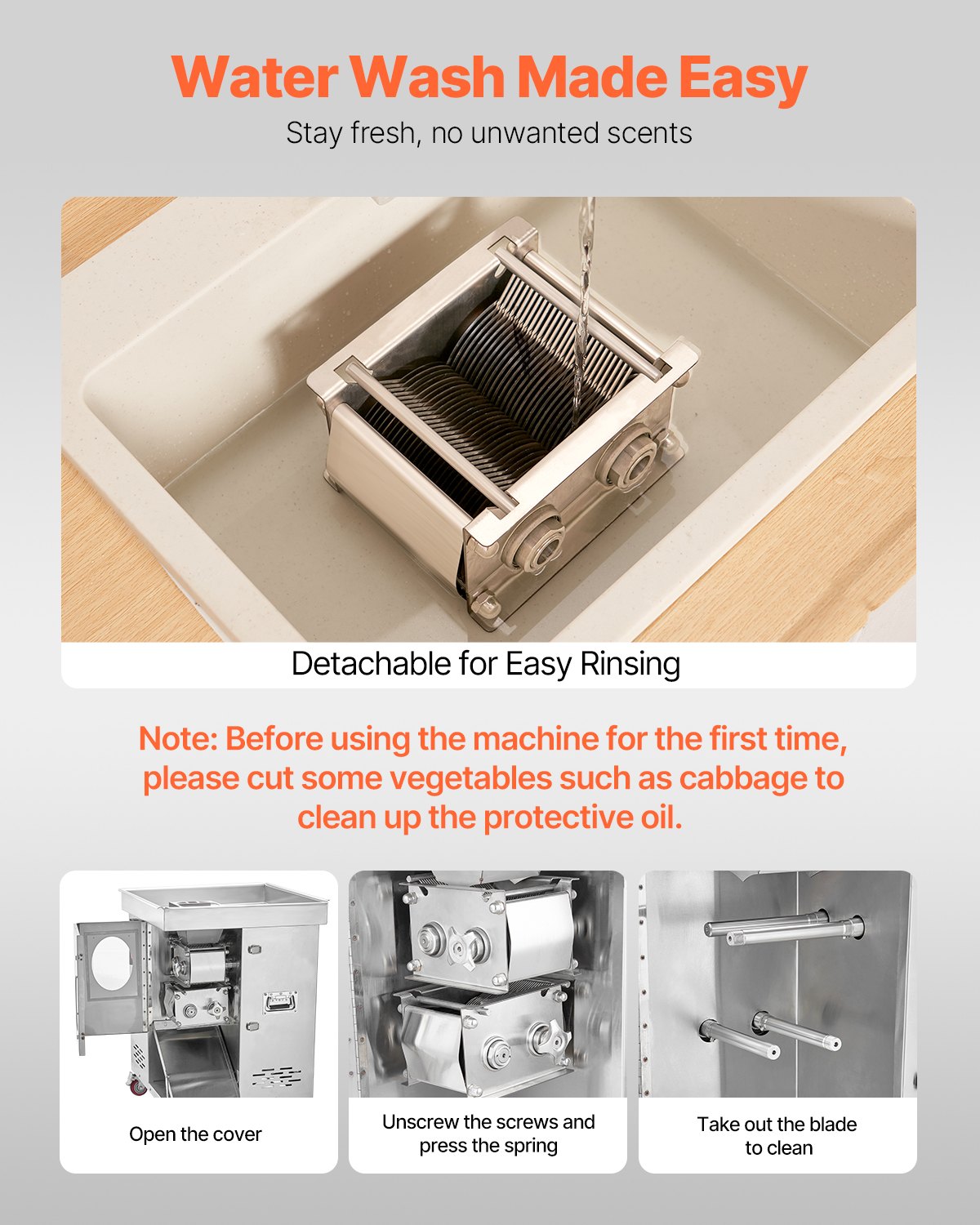 - Effortless Cleaning & Care: Our meat cutter cutting machine is easy to clean and maintain. The blades are coated with protective rust-proof oil. Since water rinsing alone may not fully clean up the oil, please cut some vegetables, such as cabbage, to clean up the protective oil before your first use.