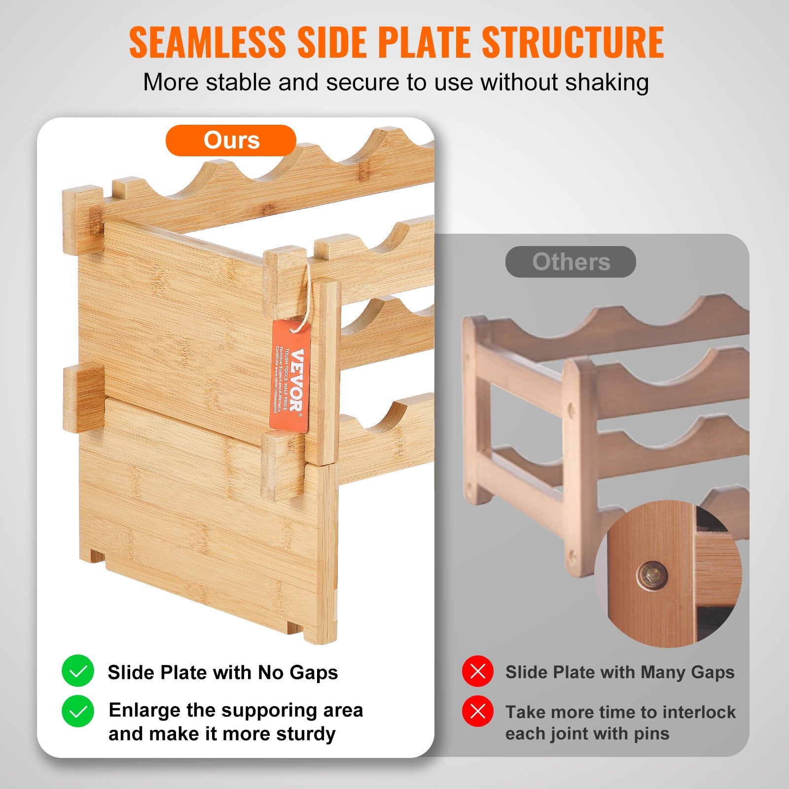 - Sturdy Construction: Our wood wine rack is very sturdy, with upgraded side panels that eliminate gaps and expand the support area. This design ensures the rack's stability, preventing wobbling, tilting, or falling, and providing excellent safety for your bottles over long-term use.