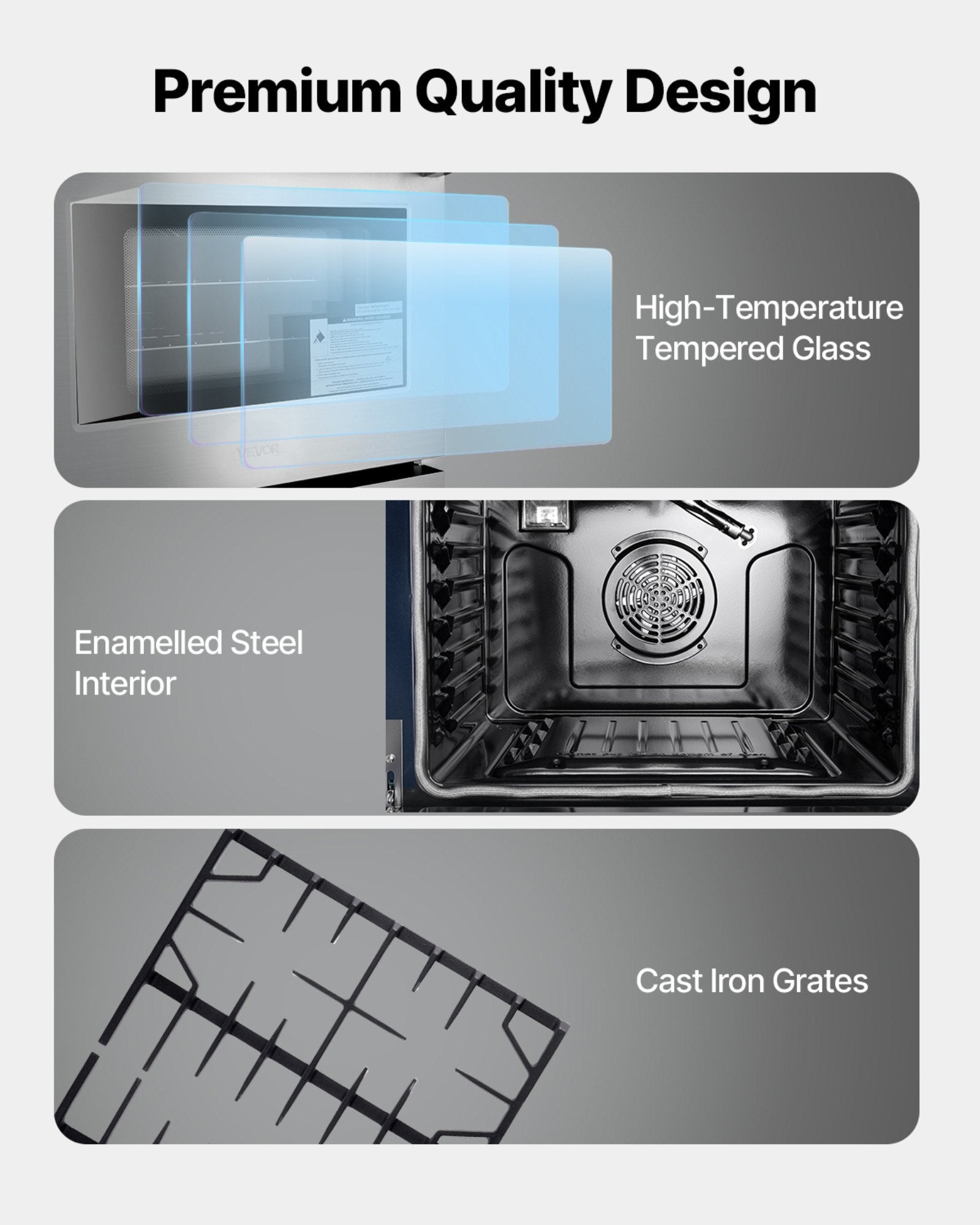 - Quality Materials: This gas range oven features cast iron grates for heat-resistance and durability. It includes a 3-layer enamel glass door for insulation, mechanical knob controls, a halogen light, and a bottom storage drawer for convenience