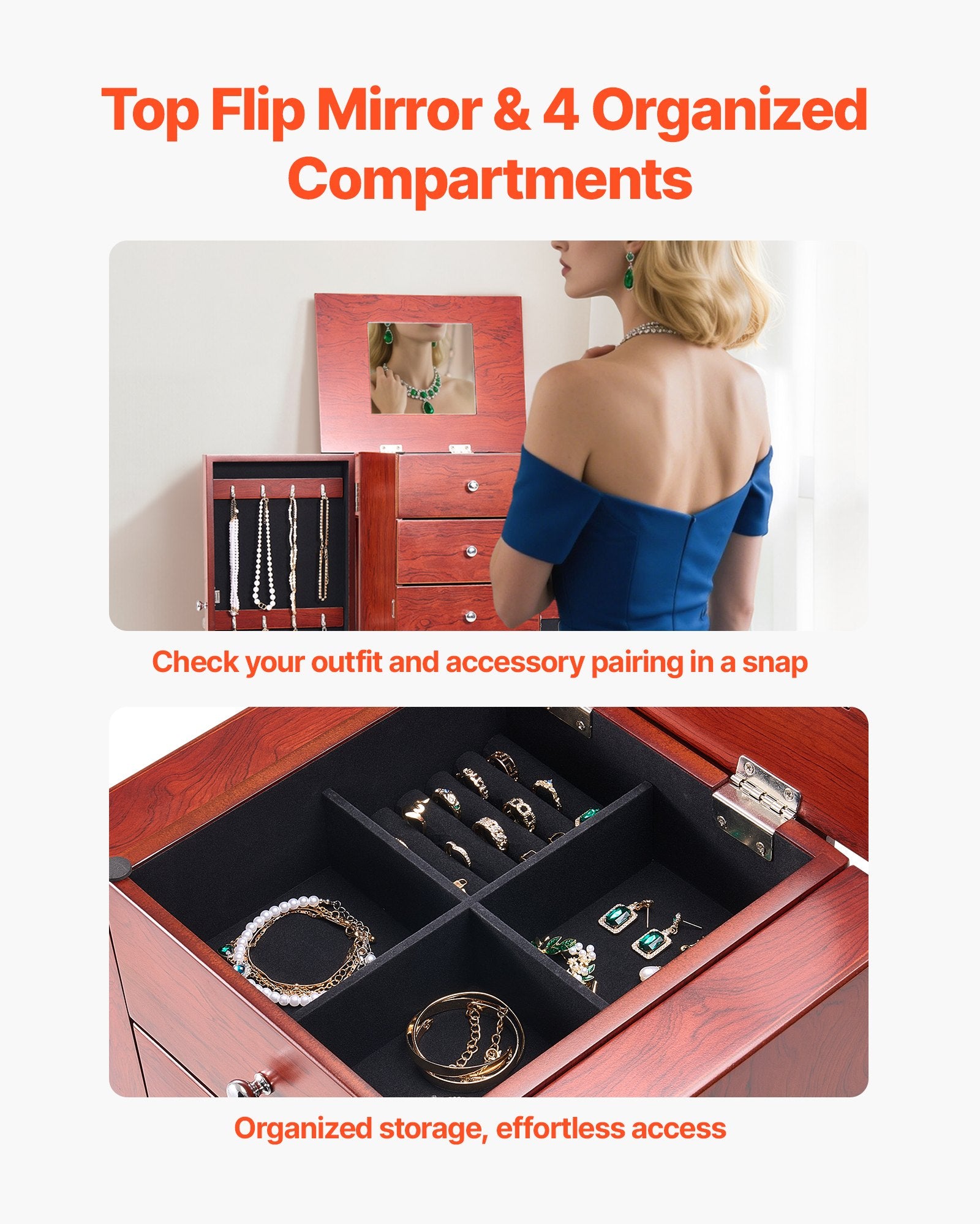 - Top Flip Mirror: The flip-open mirror and 4-compartment tray with ring slots provide instant visibility and easy access, making jewelry pairing effortless and elegant