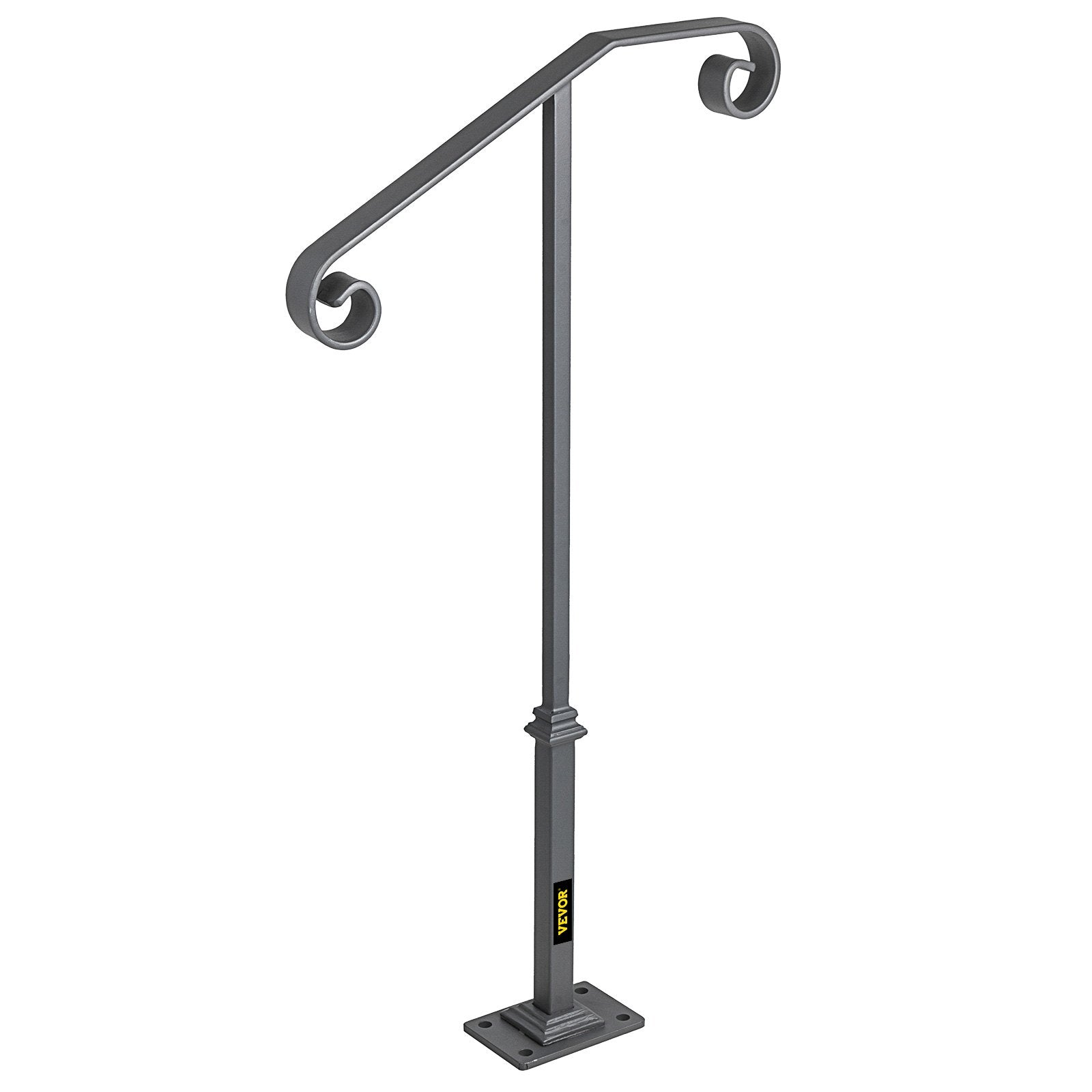 Handrails for Outdoor Steps, Fit 1 or 2 Steps Outdoor Stair Railing, Single Post Wrought Iron Handrail, Gray Transitional Porch Railings for Concrete Steps or Wooden Stairs with Base