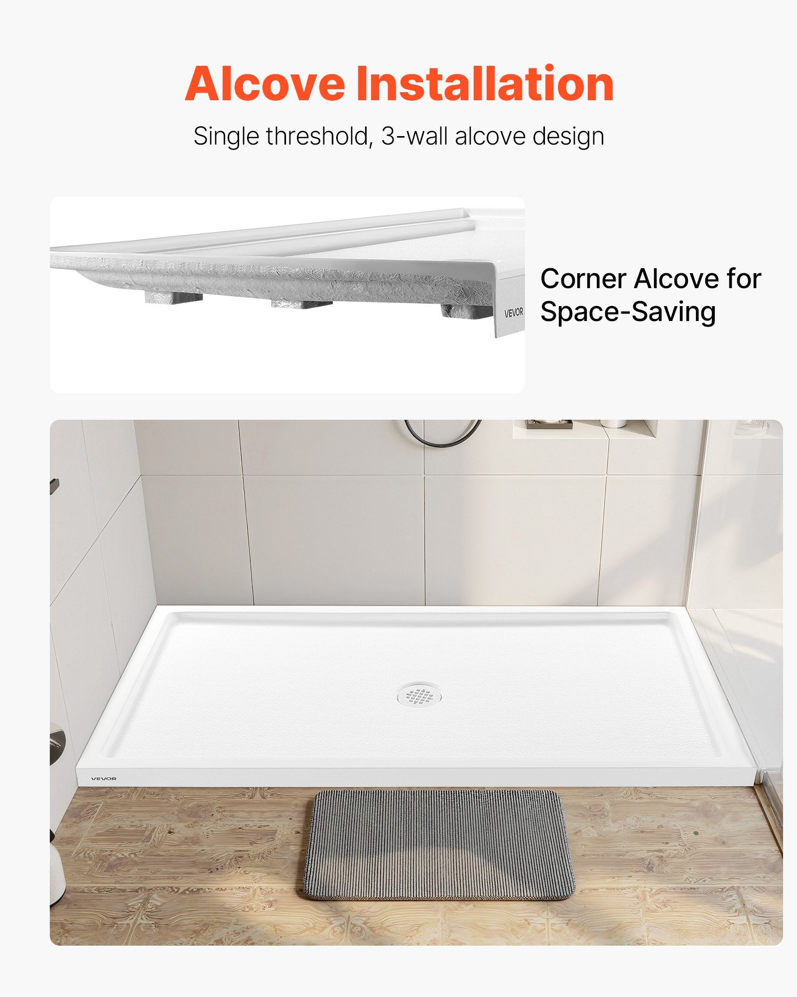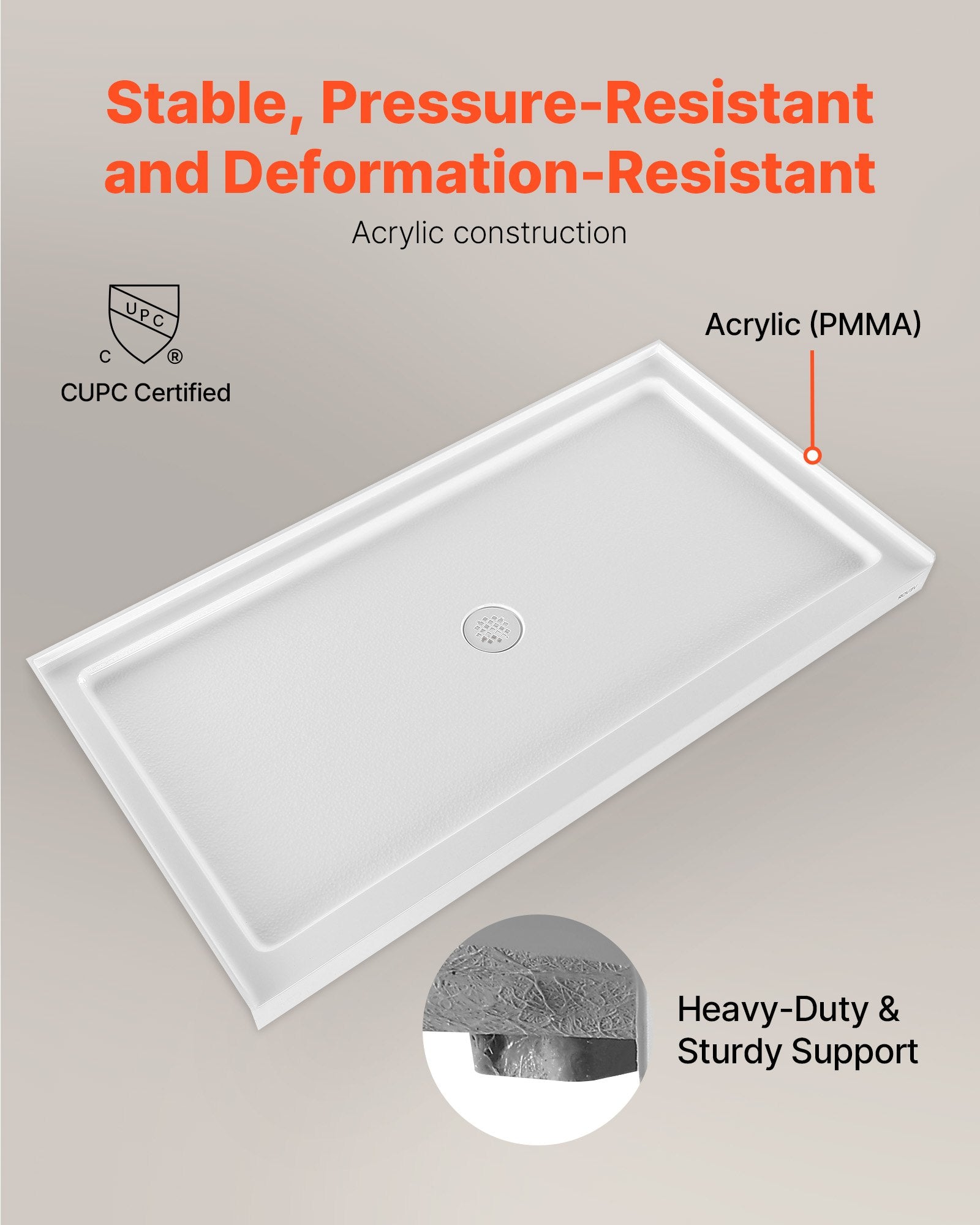 - Durable & Crack-Ready Build: Made with durable high-gloss acrylic, this shower pan base features molded construction and bottom support at key points. It holds up under regular foot traffic without deforming and stands strong even during multi-user use