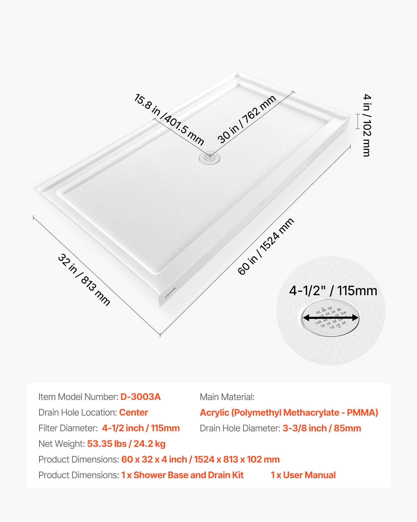 - Complete Drain Kit: Built for convenience, this shower base features a 3-3/8" (85mm) center drain hole and comes standard with an anti-clog hair cover and full drainage kit. Choose from left, center, or right configurations for faster installs—no extra parts required