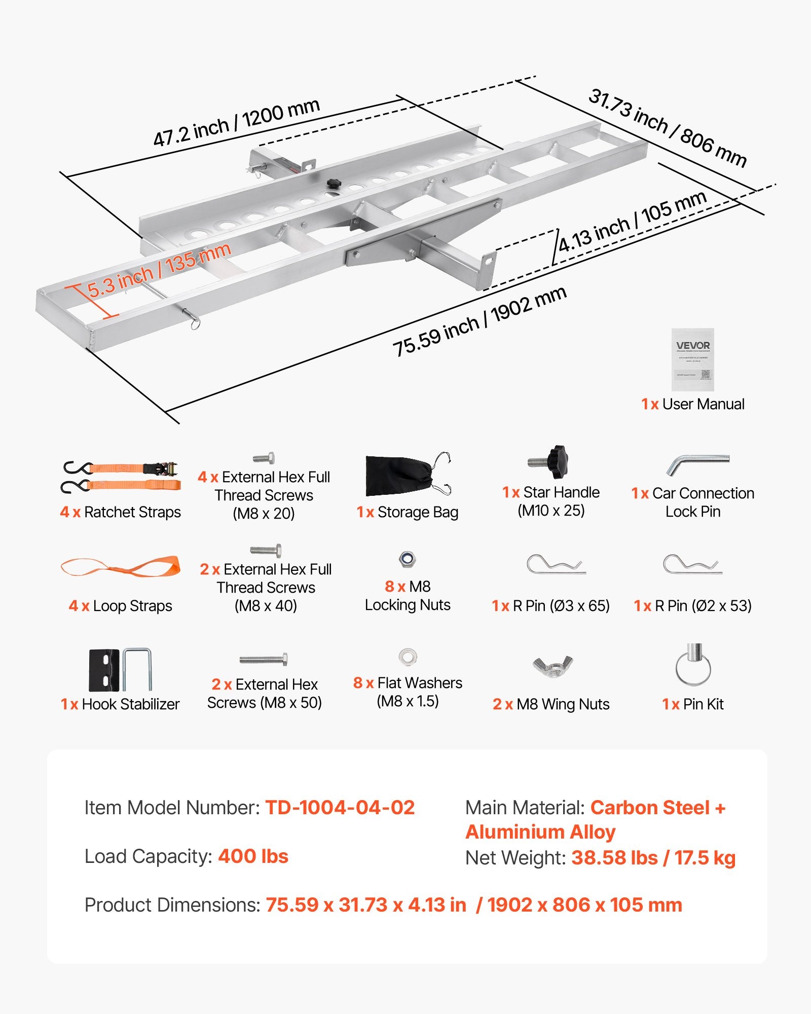 Motorcycle Carrier, 400 lbs Capacity, Heavy Duty Aluminum Hitch Mount Rack with 47in Loading Ramp, Straps & Stabilizer, Scooter Dirt Bike Trailer Hauler for Car Truck with 2-Inch Hitch Receiver
