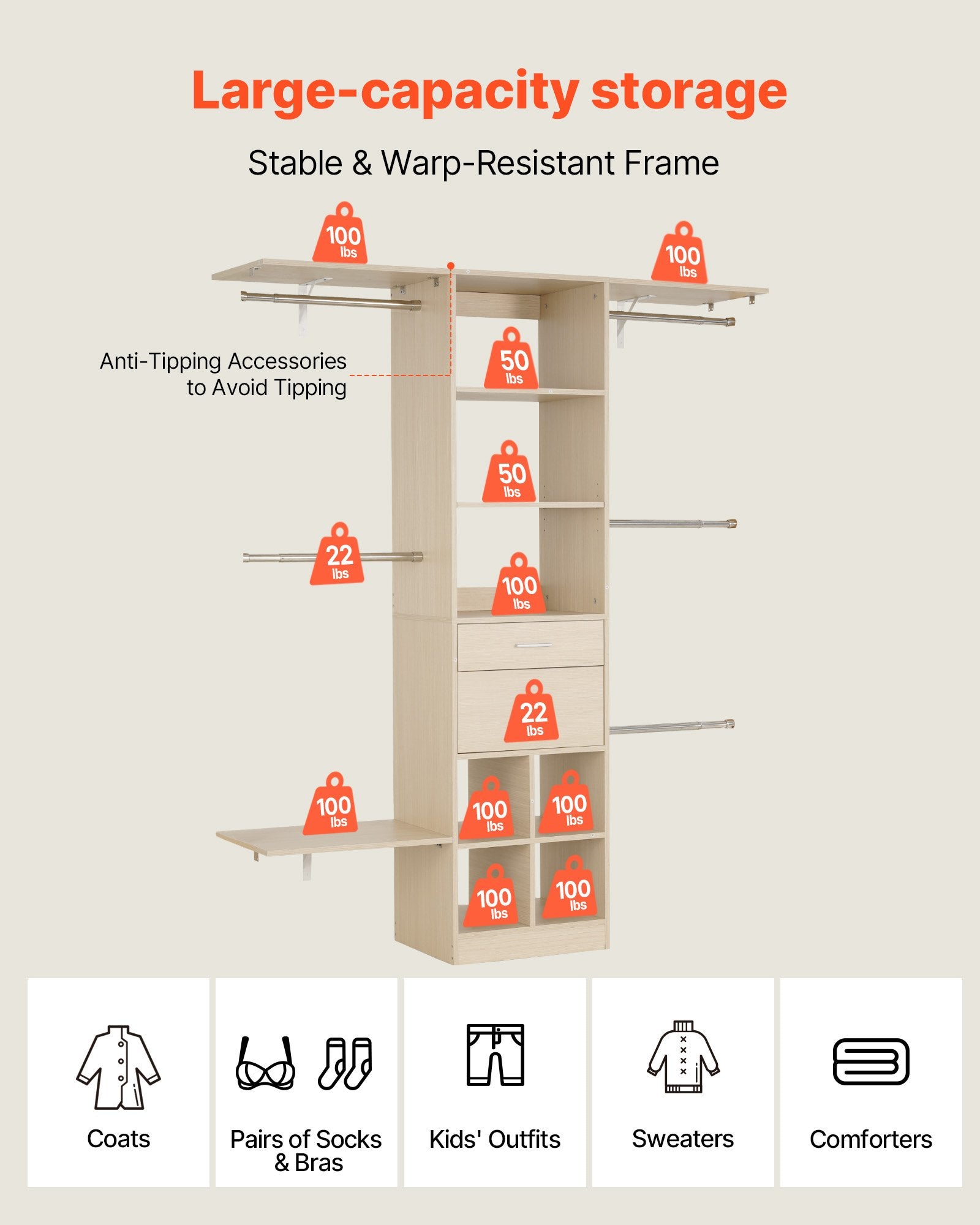 - Large Capacity: Supporting up to 800 lbs / 362.7 kg, this closet system with drawers can hold around 100 garments. Use its compartments to separate items neatly, keeping everything visible and easy to access