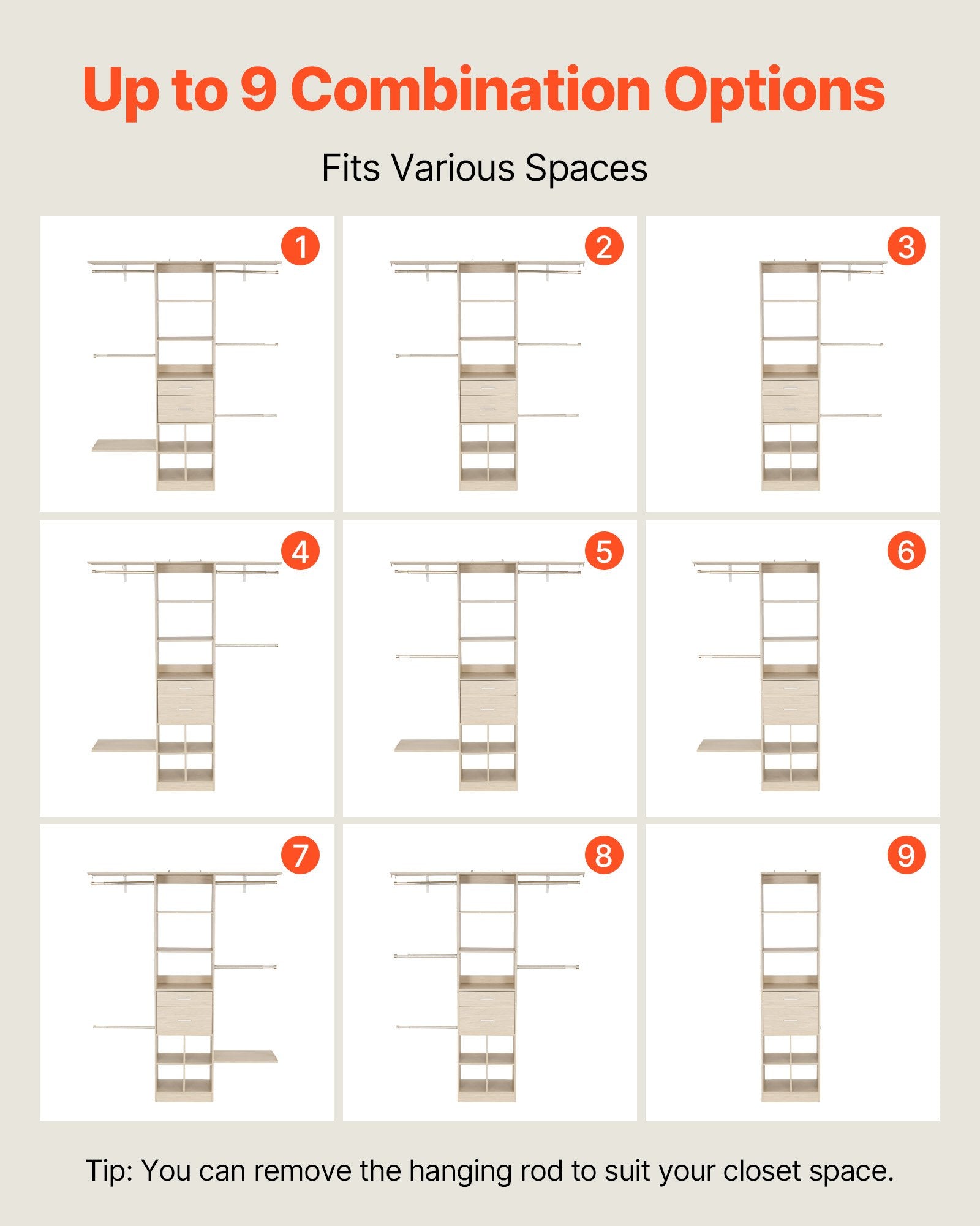 - Zoned Storage: The wooden closet shelf features 17 compartments for hanging, displaying, or stacking clothes, making it easy to organize seasonal clothing and bedding for a family of three or an individual