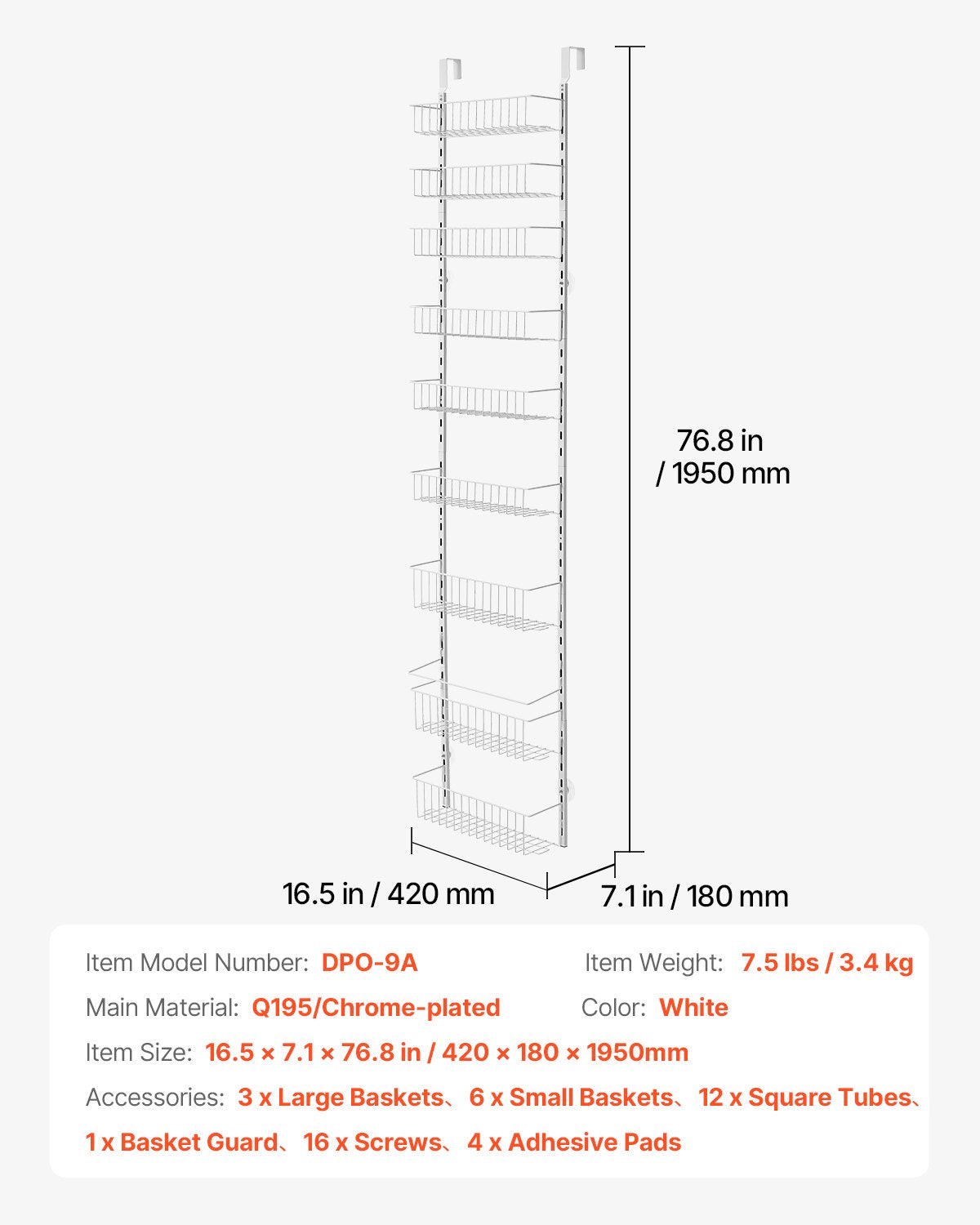 Over the Door Pantry Organizer, 9-Tier Pantry Organization and Storage, Heavy-Duty Steel Hanging Spice Rack, Adjustable Wall Seasoning Shelves, for Home Kitchen Laundry Room Bathroom, White