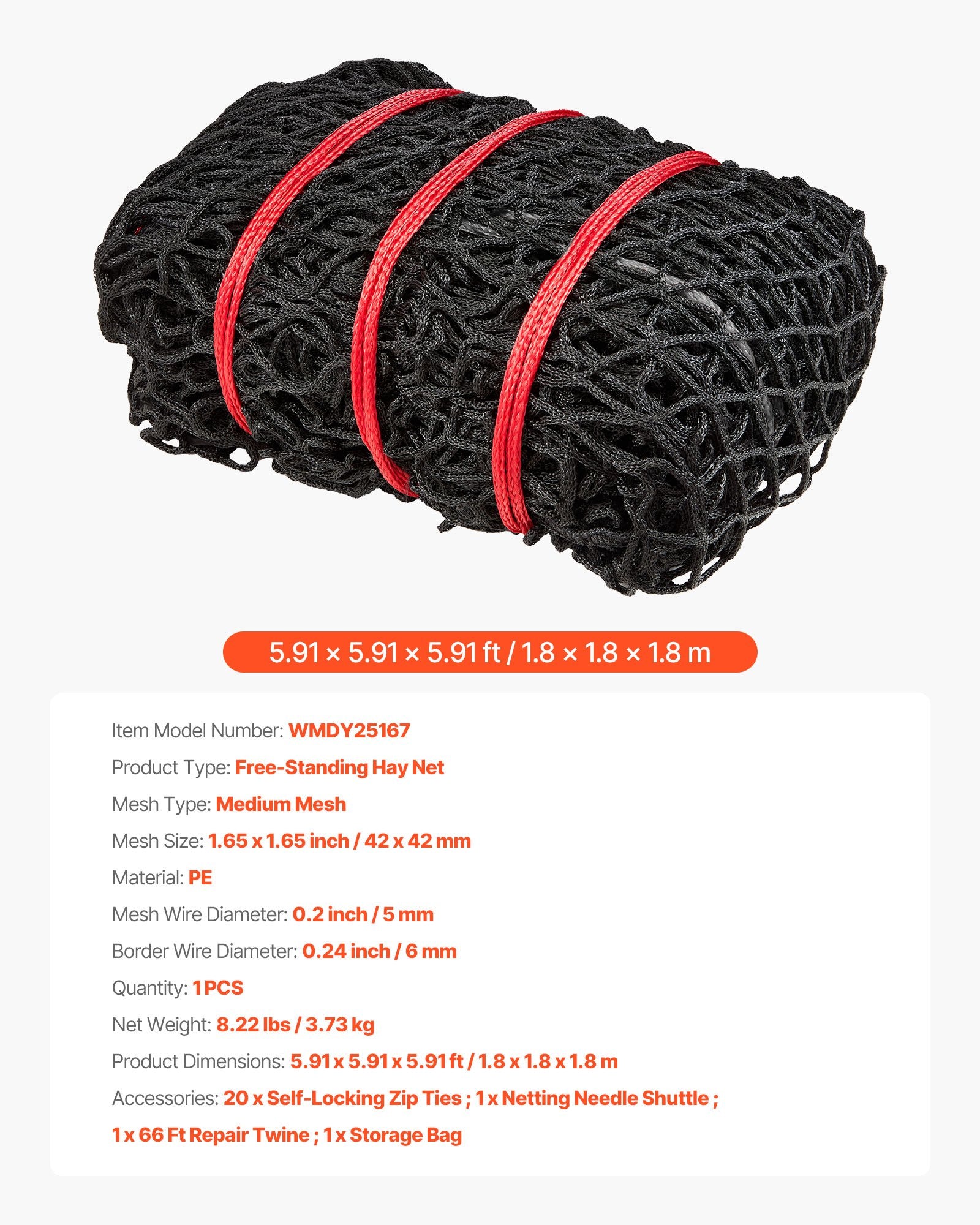 Round Bale Hay Net, 5.91 x 5.91 x 5.91 ft, 1.65 inch Holes, PE Material, Knotless Design, with Zip Ties, Needle Shuttle, Repair Twine and Storage Bag, Slow Feeder Round Bale Net for Horses