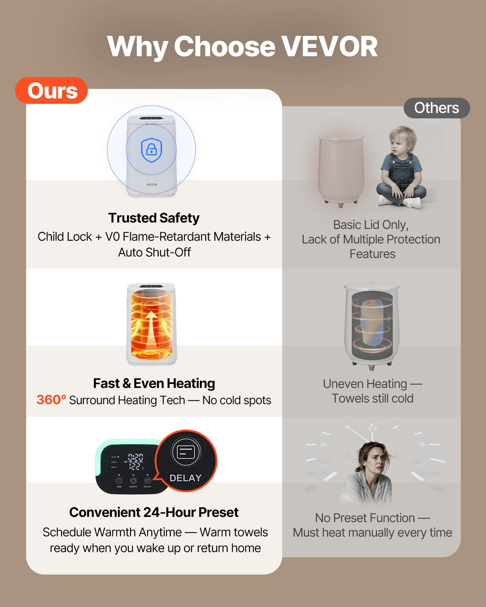 - 5-Side 360° Even Heating: Vevor's towel warmers for bathroom uses a 5-side 360° heating system (bottom + walls) to keep every inch of your towel toasty-warm—no more cold spots or uneven heat!