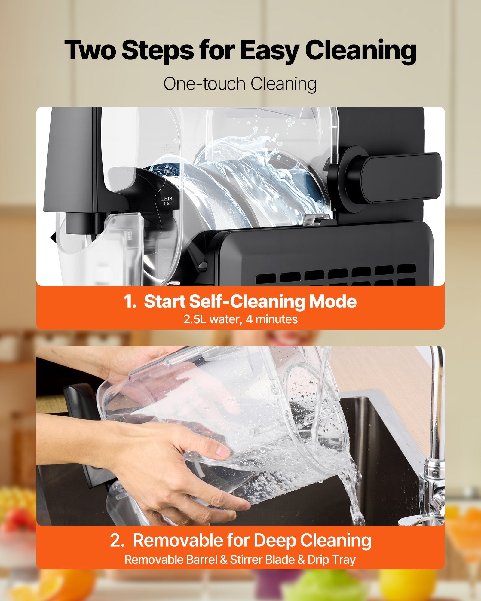 - Easy to Clean: This frozen drink machine features a self-cleaning mode for easy maintenance. For a deep clean, simply unlock the rear handle, remove the barrel and parts, then rinse them with water or place them in the dishwasher. Additionally, it has a detachable drip tray at the bottom for added convenience in cleaning