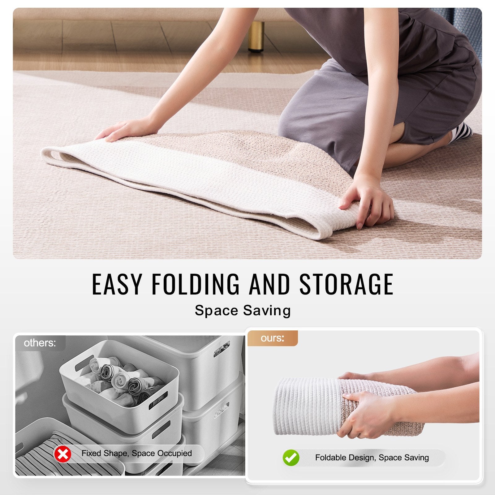 - Foldable Storage: Made from soft, shape-retaining cotton, these throw blanket baskets can be easily folded when not in use, saving storage space. They are machine or hand washable for easy cleaning. If wrinkled, simply iron lightly or fill with clothes to quickly restore the original shape.