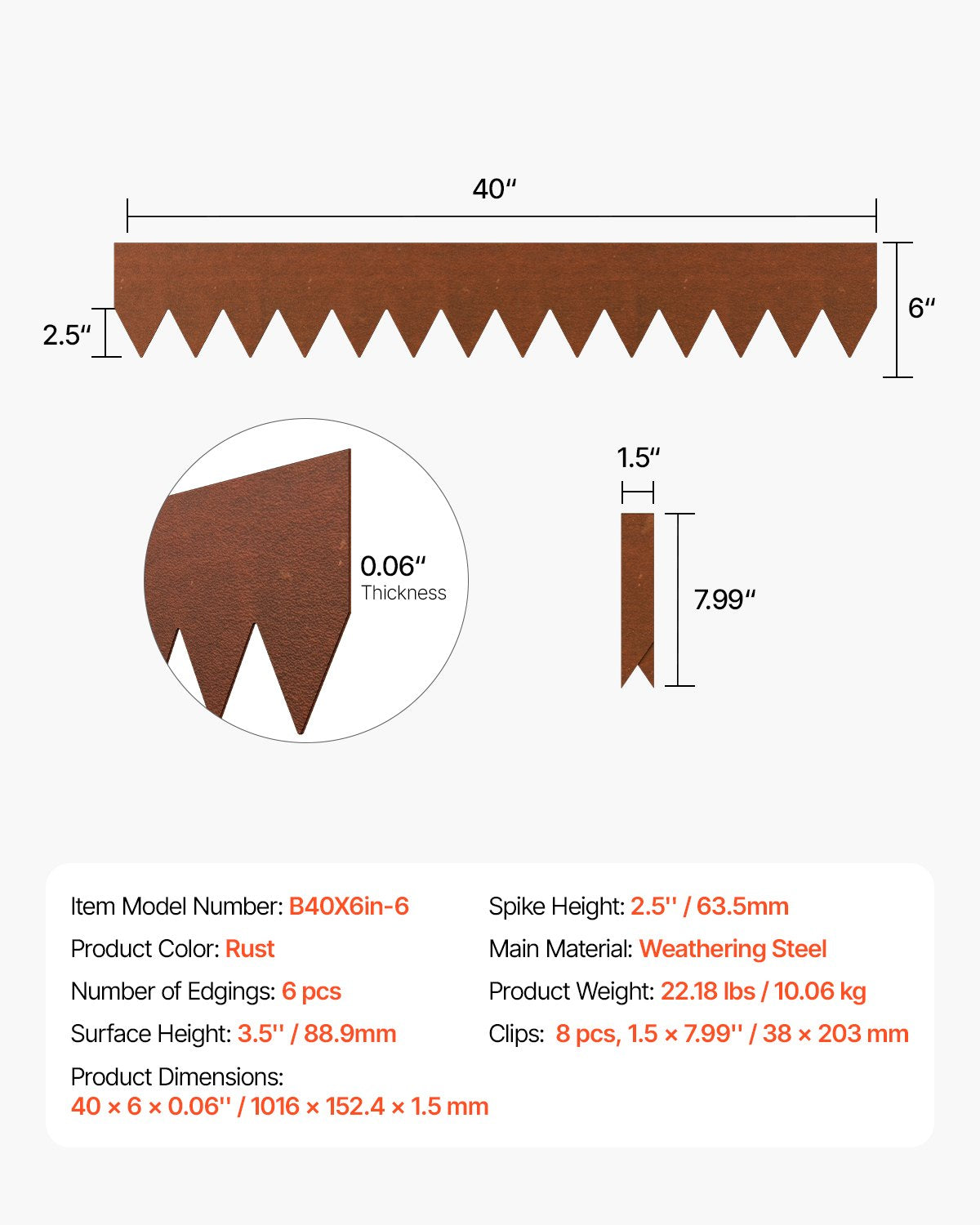 - What You’ll Receive: The set includes 6 metal yard edging, 1 pair of installation glove, 8 clips and 1 instruction manual. The extended spike design makes it easier to drive the pieces into the ground, reducing installation effort. Spend more time enjoying your outdoor space and less time on maintenance!