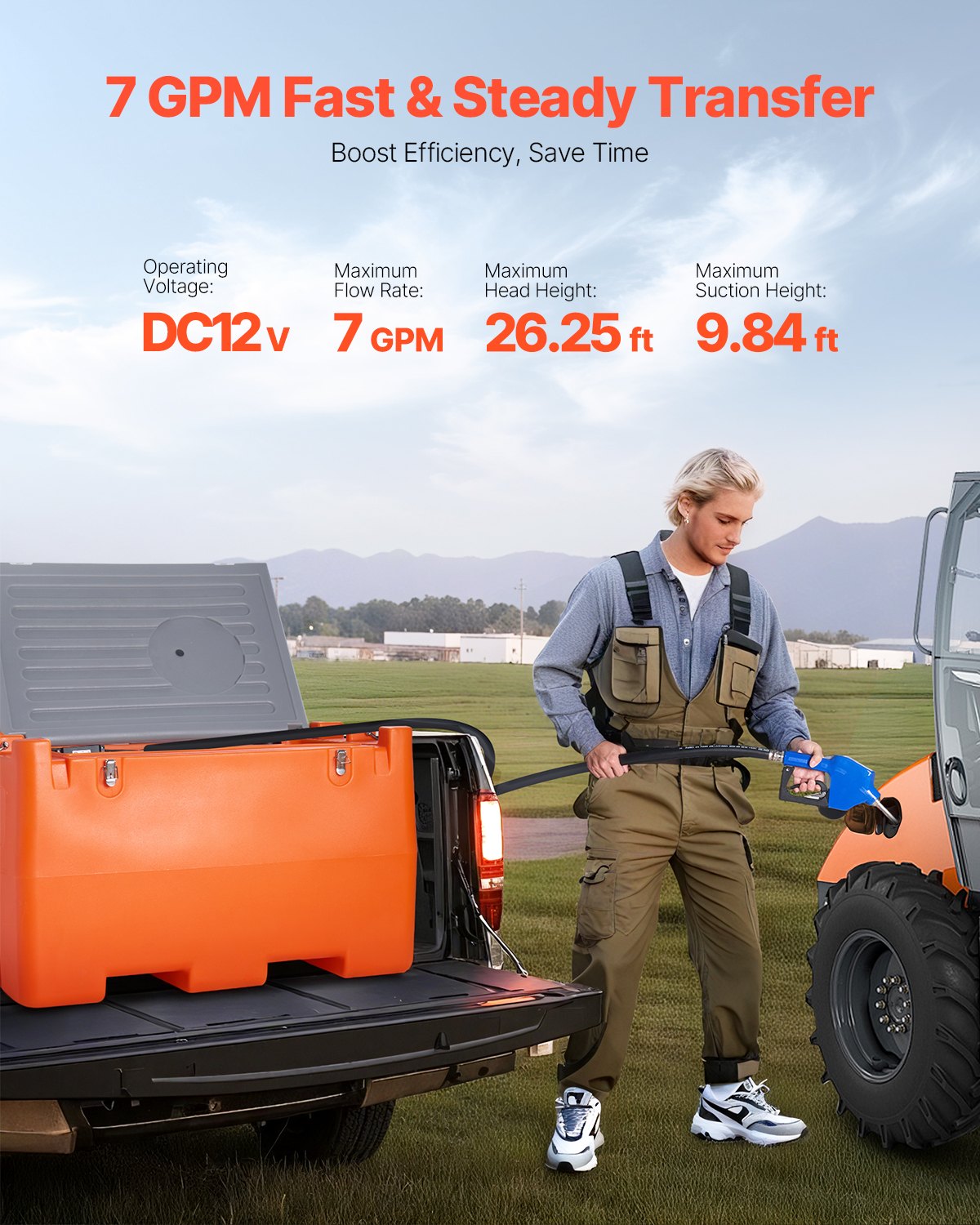 - High-Efficiency Transfer Pump: This diaphragm self-priming DEF transfer pump is powered by a strong copper motor for smooth, stable operation. With a maximum flow rate of 7.0 GPM, lift up to 26.25 ft, and suction of 9.84 ft, it ensures efficient, uninterrupted delivery