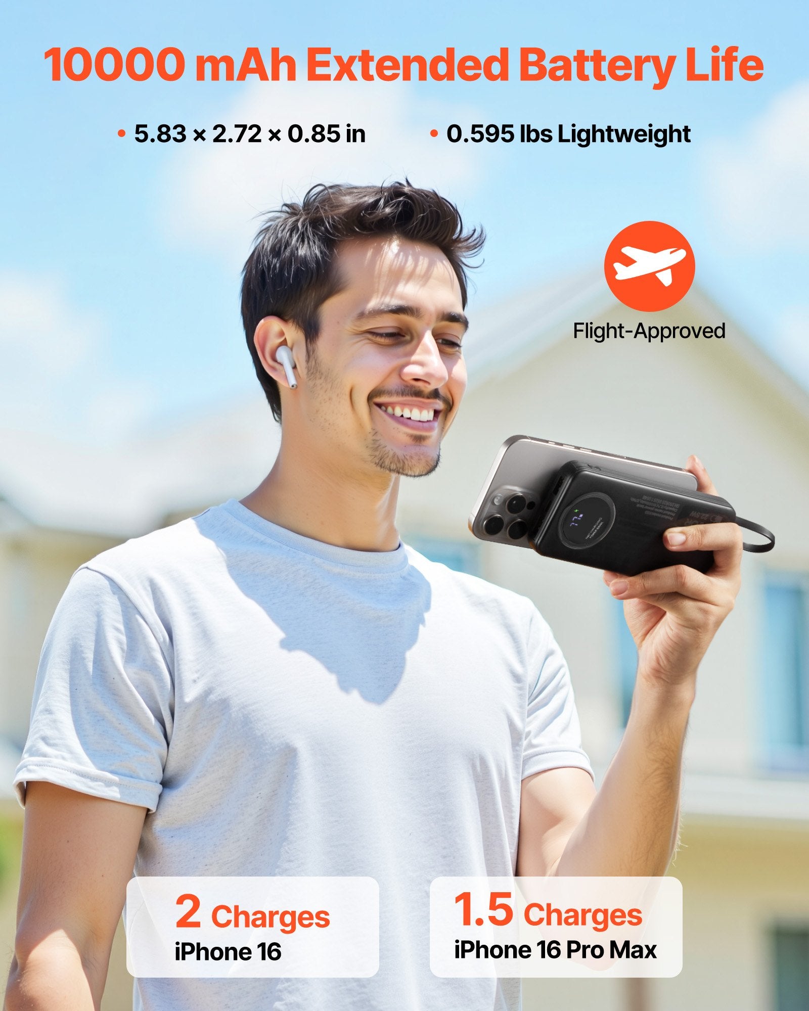 - Slim Build, Big Power: Compact at 5.83 x 2.72 x 0.85 in and weighing only 0.595 lbs, the power bank with built in cables is easy to carry. With a 10,000 mAh capacity, it can charge your iPhone 16 up to 2 times or your iPhone Pro Max about 1.5 times