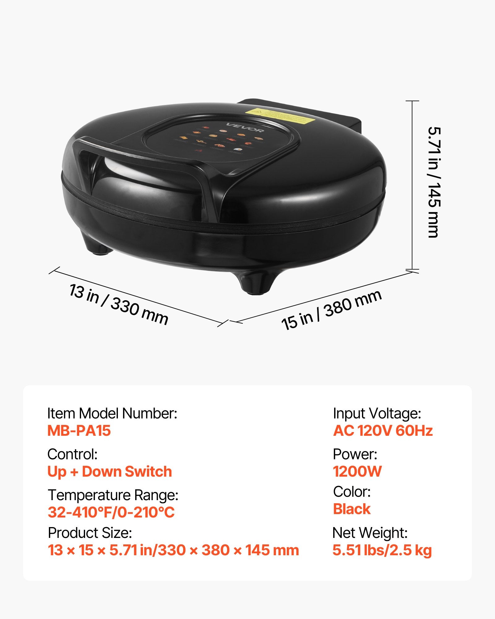 Pizza Oven, 12 in Electric Pizza Maker, 1200W Electric Pizzas Cooker with Non-Stick Coating, 180° Open for Dual Side Baking, Heats up to 410 ˚F, Multi-Function Cooking, for Pizzas, Barbecue