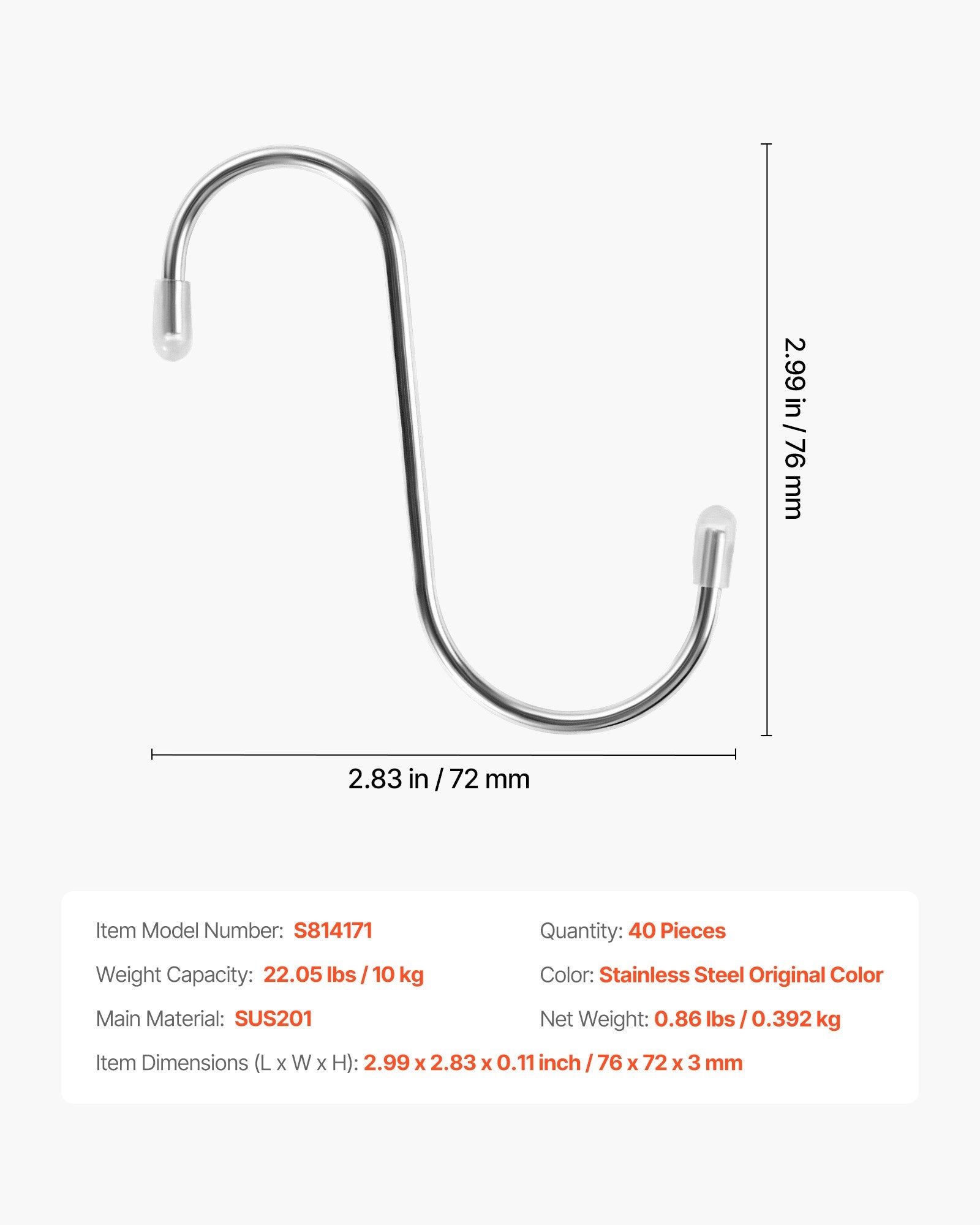 S Hooks 40 Pack, 3.4 Inch Metal S Shaped Hangers of 22.05 LBS Load Capacity, Heavy Duty Stainless Steel Hanging Hooks for Hanging Plants, Jeans, Clothes in Garden, Closet, Kitchen, Bathroom