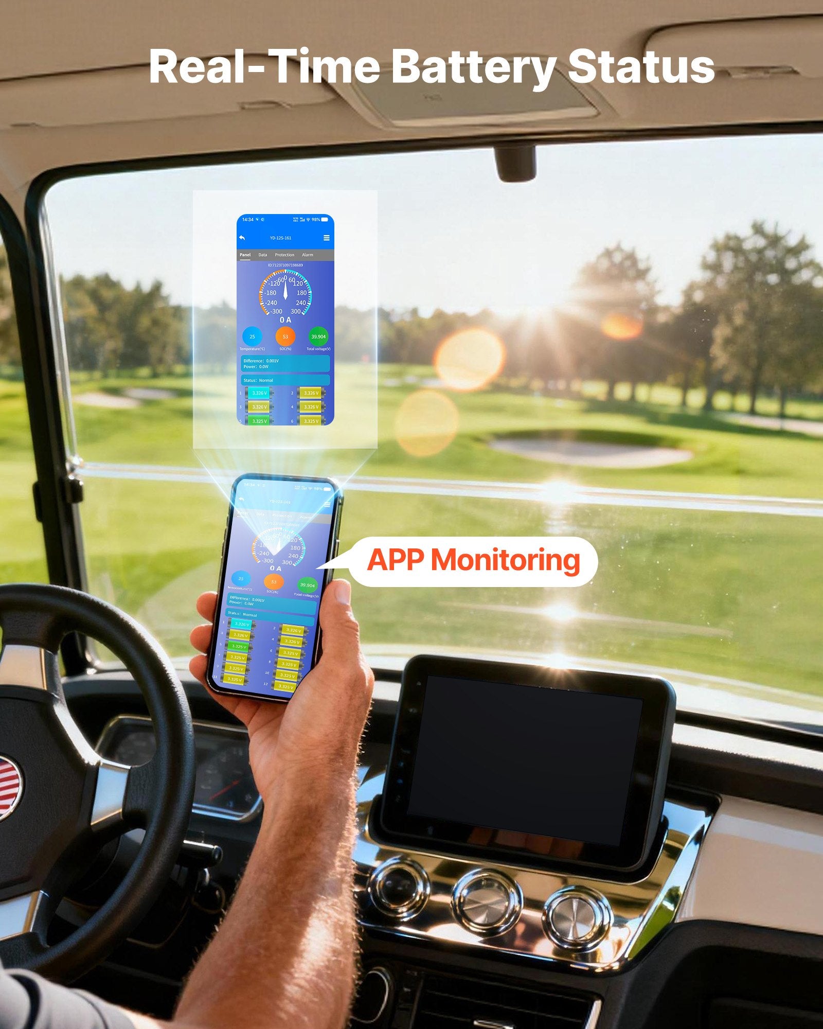 - Real-Time Monitoring: Connect your LiFePO4 golf cart battery to the smartphone APP via Bluetooth to check real-time battery information, such as charge/discharge status. Monitor your battery health just like checking your phone’s battery level