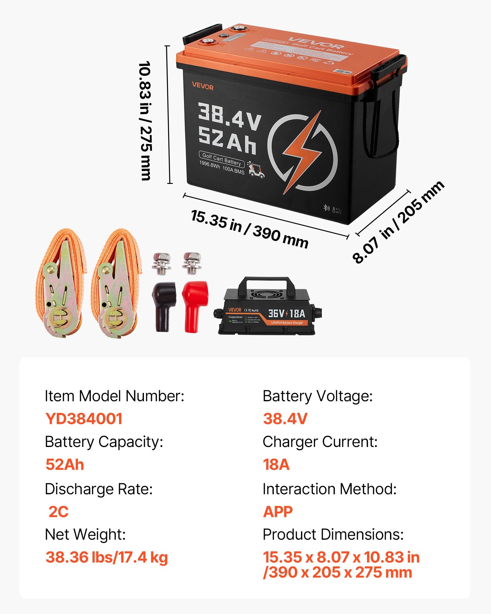 36V (38.4V) 52AH Lithium Golf Cart Battery, with 18A Charger, Lifepo4 Battery Kit, Built-in 100A BMS, 4000 Cycles, 2C Discharge Rate, Bluetooth & Mobile APP, for Golf Carts, Trolling Motors