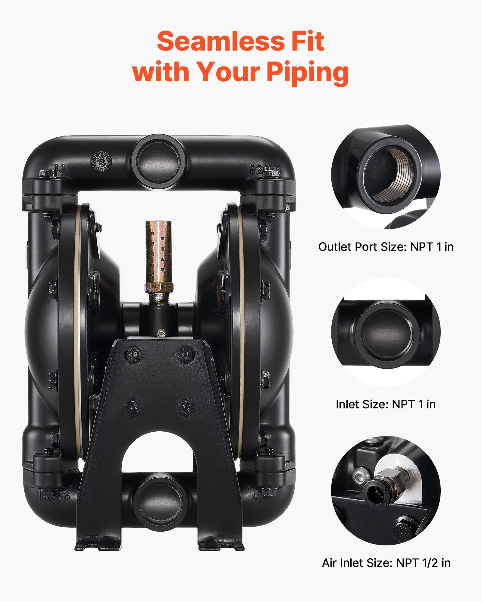 - Powerful Pneumatic Performance: Delivers 35 GPM max flow rate, 114 PSI max pressure, and 262 ft max head lift. This air diaphragm pump quickly and efficiently transfers liquids to target tanks in minutes without worrying pressure