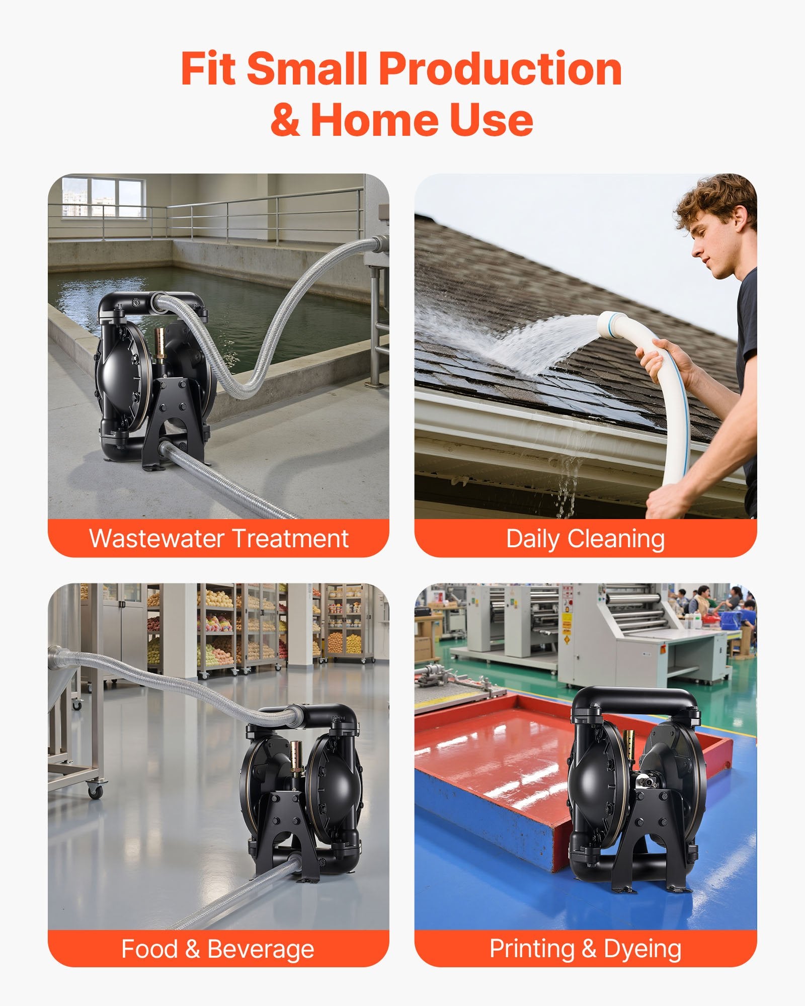 - Durable & Leak-Proof: Equipped with an aluminum alloy pump body and triple-layer rubber diaphragms for wear resistance. This air operated diaphragm pump features a full-bolt structure for a secure seal. Built for long-term use, it runs dry without damage