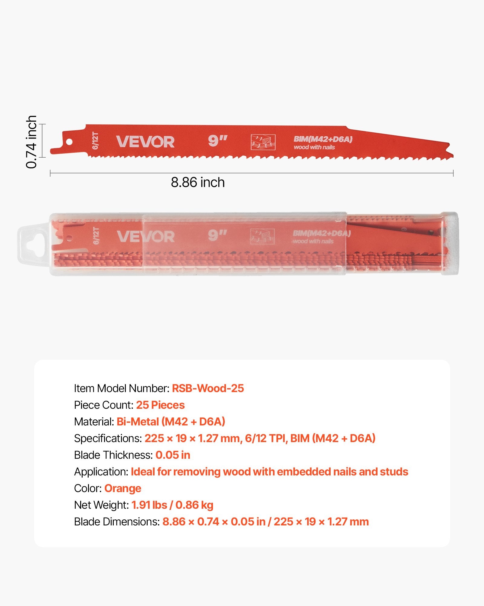 Reciprocating Saw Blades, 25 Pack, 6/12 TPI Bi-Metal Reciprocating Saw Blade Set with Universal Shank, Sharp Teeth for Fast and Smooth Cuts, for Wood and Nail-Embedded Wood Demolition, Orange