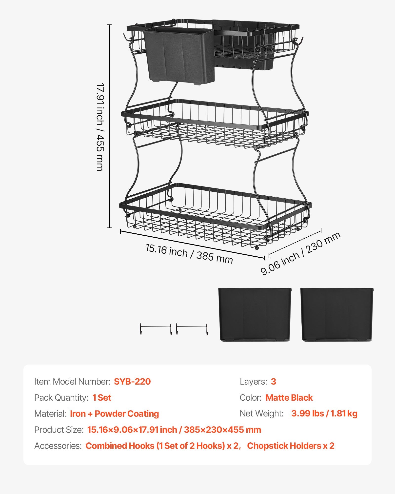 - Three-layer Large Capacity: Dimension: 15.16x9.06x17.91 in (385x230x455 mm). This countertop fruit basket allows for categorized storage of fruits, vegetables, snacks, and more. Maximizes vertical space to solve clutter and keeps items organized
