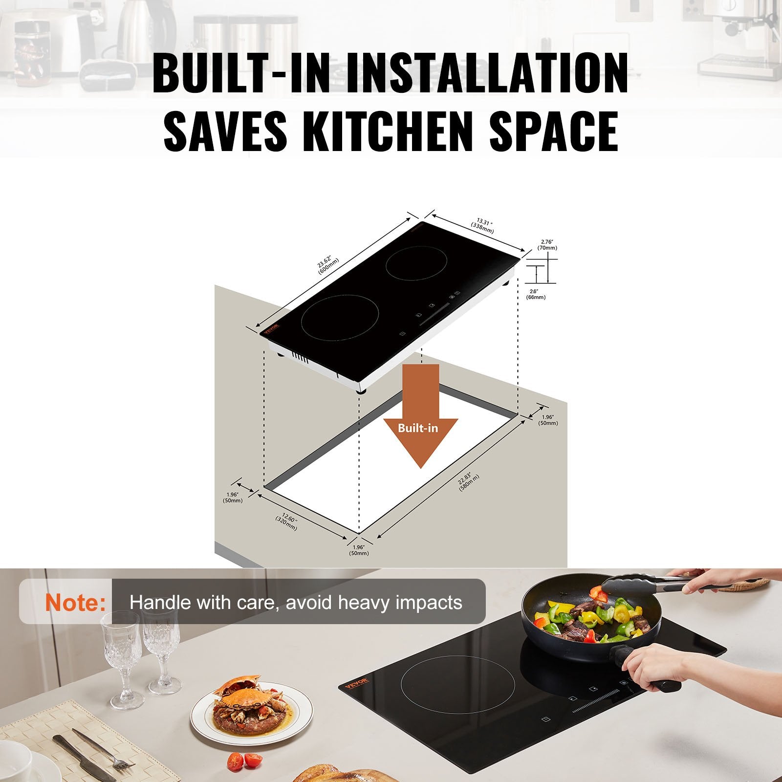 - Built-In Design: The 24-inch electric cooktop features a built-in design to save kitchen space. It is compatible with a 120V, 60Hz voltage. The workbench cutout dimensions for installation are 580x320 mm / 22.8x12.6 inch.